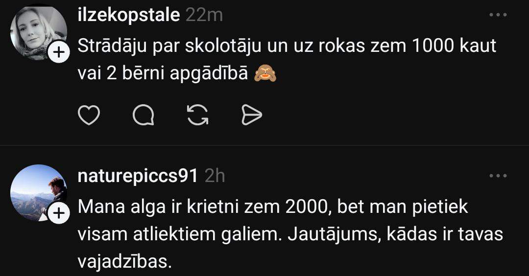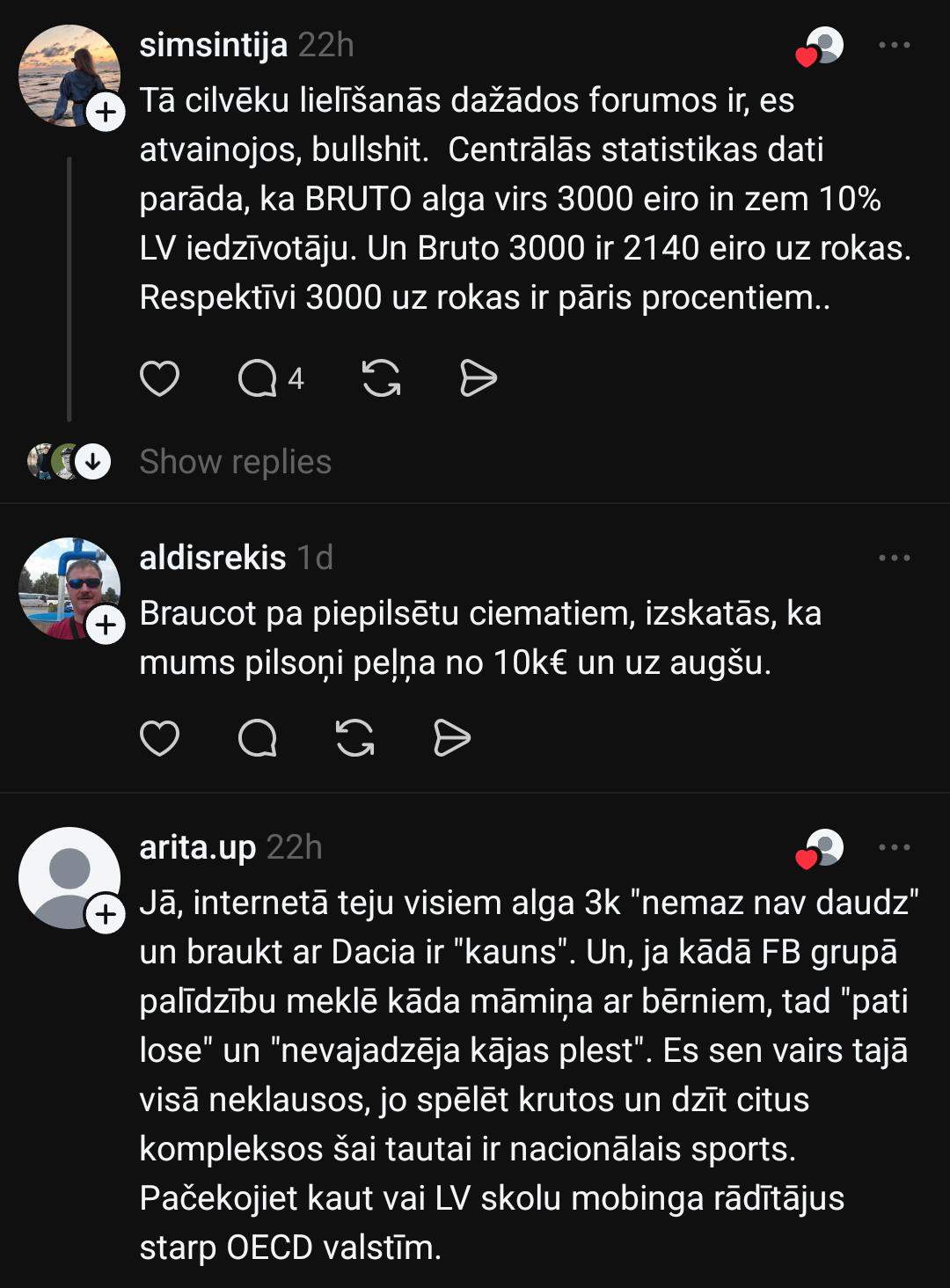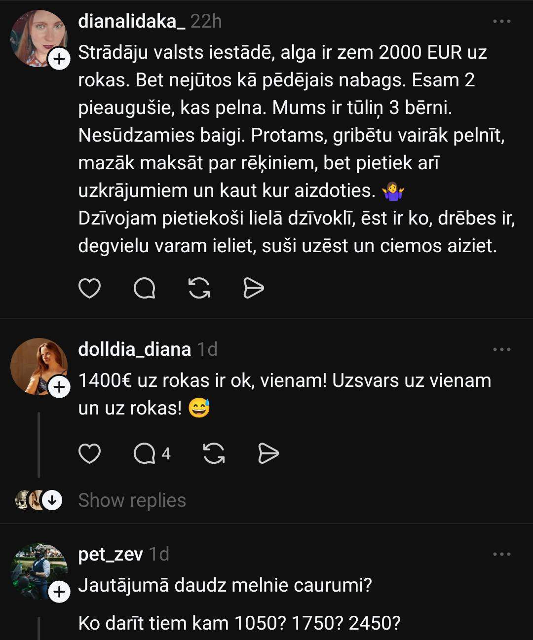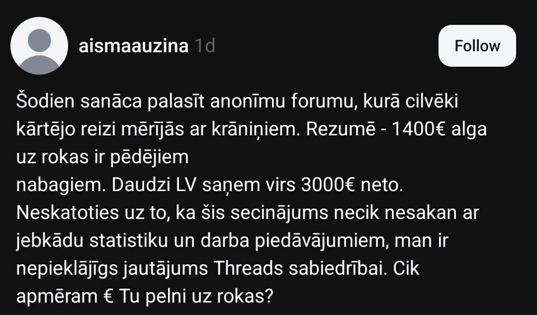 Какой-то пользователь в социальной сети «Threads» пишет: «Сегодня довелось почитать анонимный форум, где люди в очередной раз мерялись письками. Резюме — зарплата 1400 евро на руки только у последних бедняков. Многие в Латвии получают свыше 3000 евро нетто.