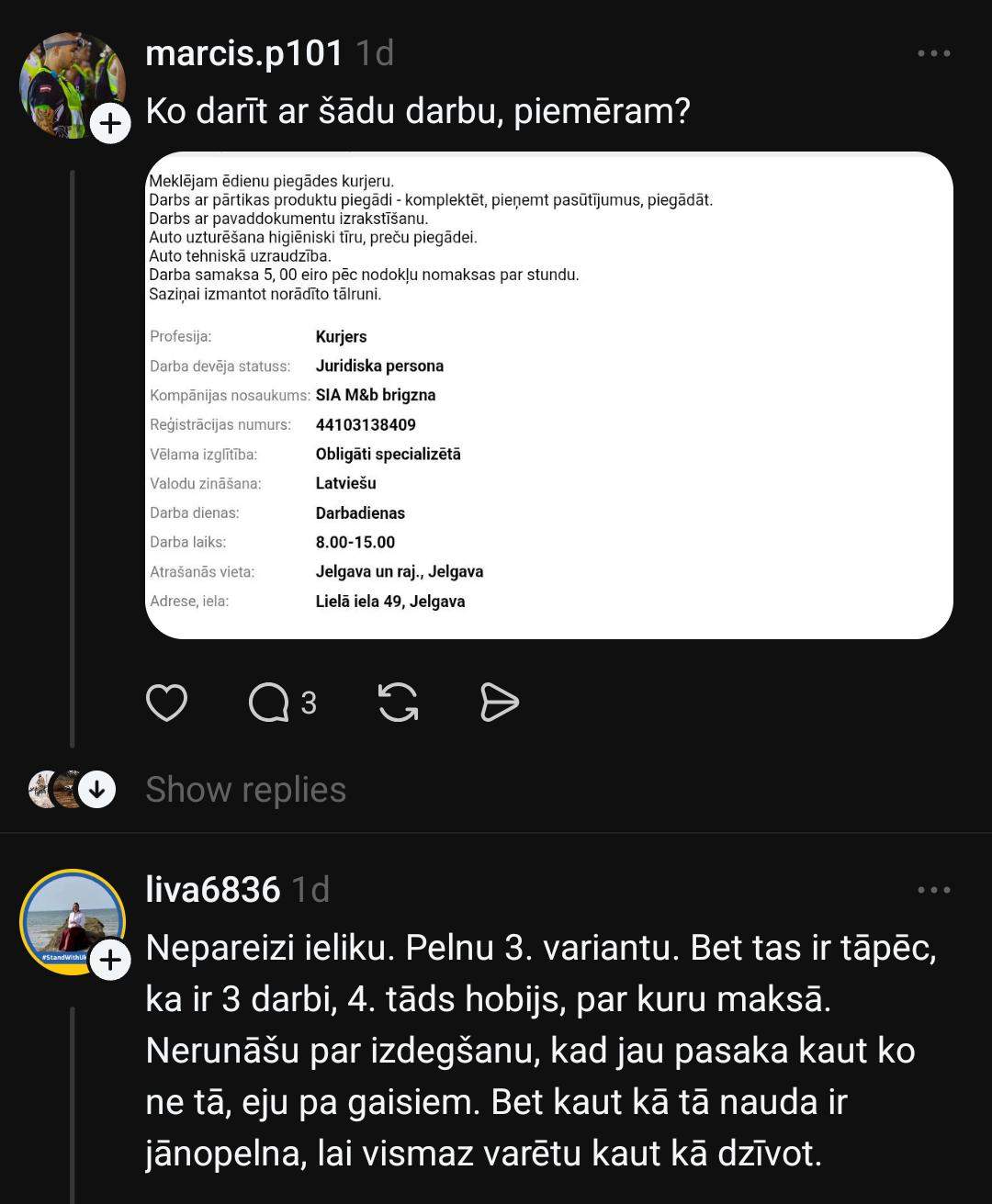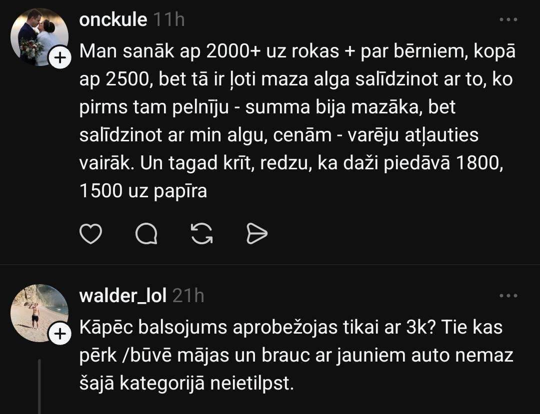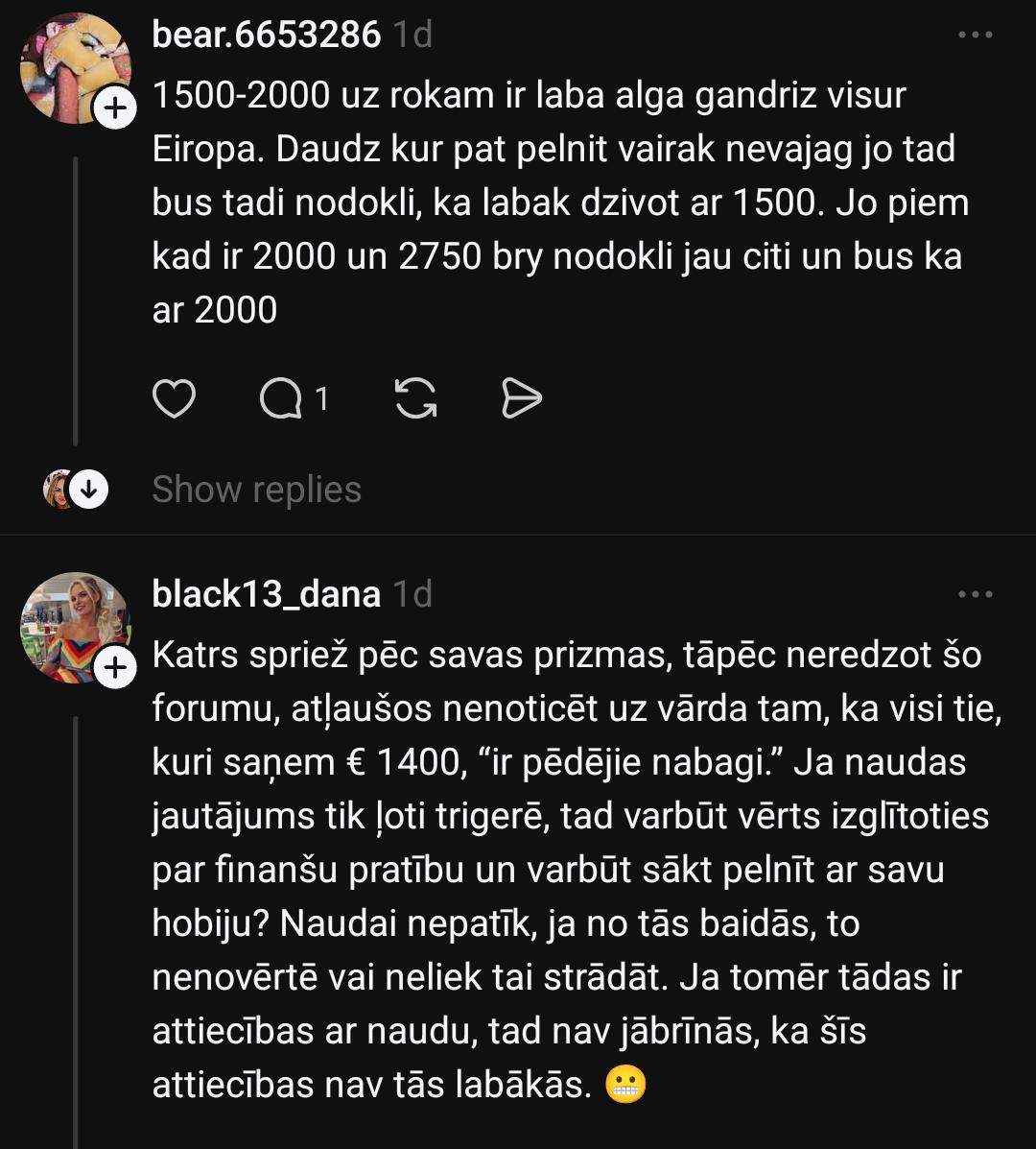 Какой-то пользователь в социальной сети «Threads» пишет: «Сегодня довелось почитать анонимный форум, где люди в очередной раз мерялись письками. Резюме — зарплата 1400 евро на руки только у последних бедняков. Многие в Латвии получают свыше 3000 евро нетто.
