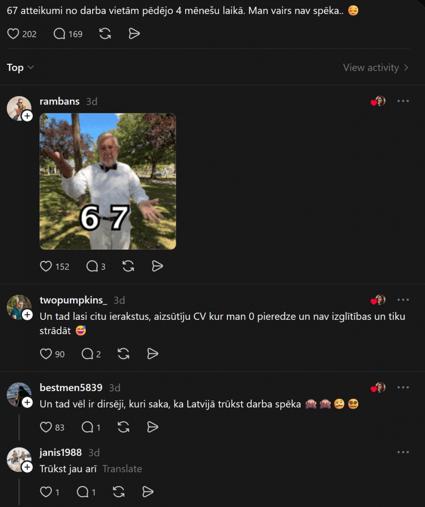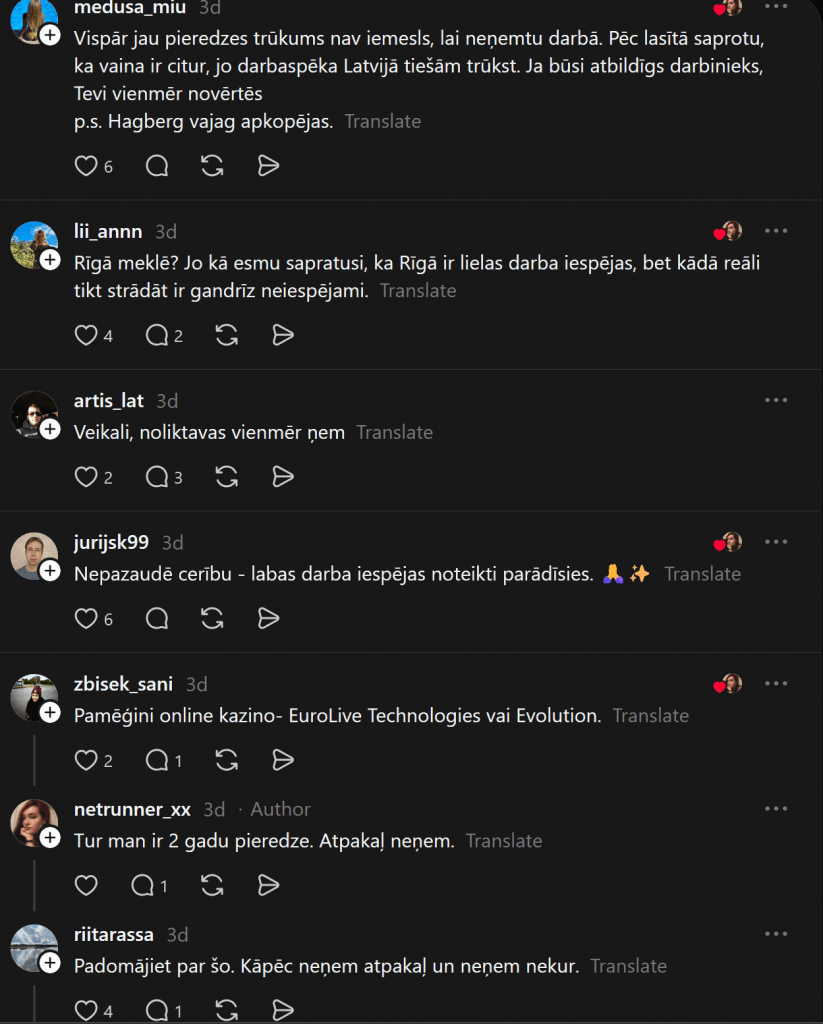 Особенно сложная ситуация у молодежи без опыта, людей старше 40 или 50 лет, а также у жителей регионов, где возможности трудоустройства ограничены. В результате рынок труда в Латвии часто кажется замкнутым кругом — без опыта работу не дают, а без работы получить опыт невозможно.