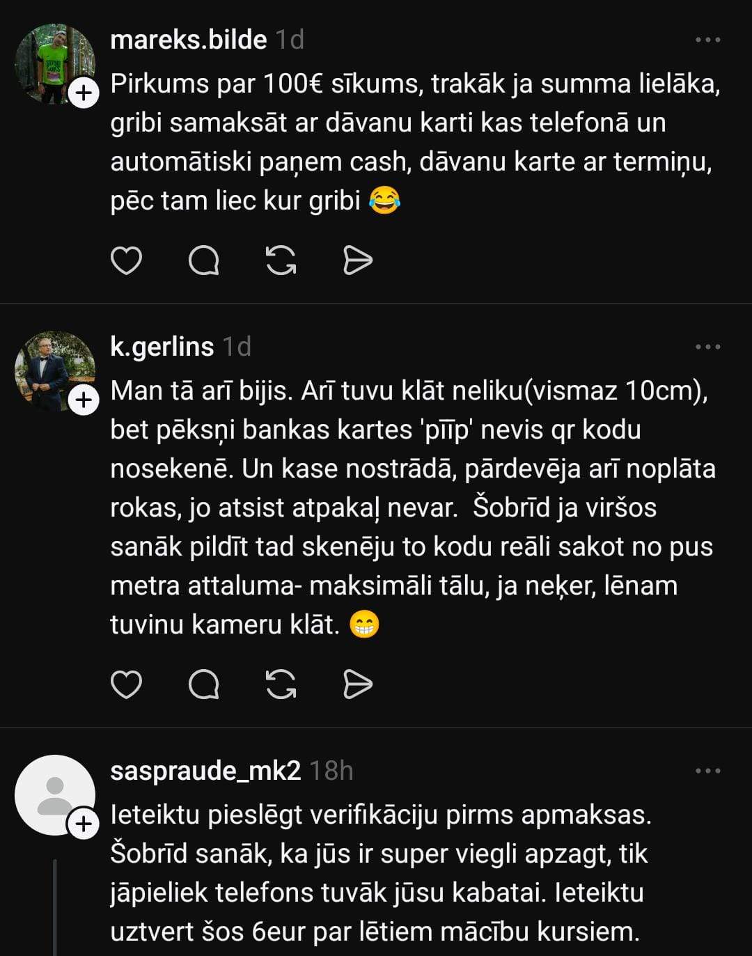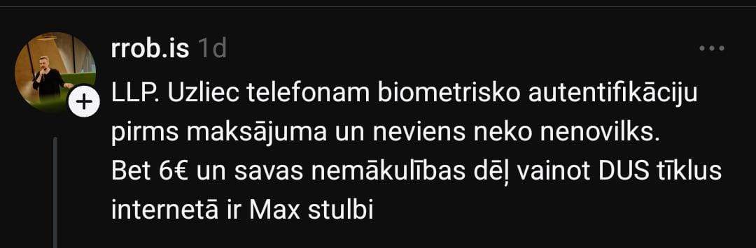 А вот Каспар отмечает, что такое положение дел — не новость: “Это часто происходит в Virši. Продавцы потом говорят, что телефон нужно держать на расстоянии, чтобы сканировать код. Только непонятно, почему нельзя приостановить оплату или запустить её только после авторизации кода.”