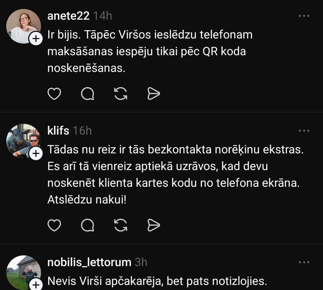 Алдис делится своим опытом на социальной платформе Threads. Он пишет: “Как Virši меня обманули на почти шесть евро, продавая топливо без обещанной скидки. Пока я пытался сканировать этот чертов QR-код в приложении у кассы, моя банковская карта, привязанная к телефону, неожиданно авторизовалась и совершила платеж на более чем 100 евро. Продавец только развел руками — больше ничего не могут сделать. Меня больше всего удивляет, что телефон был даже не в 10 сантиметрах от терминала, но система все равно сработала. Такие чувствительные терминалы есть только на заправках Virši. Теперь у меня большой зуб на Virši.”