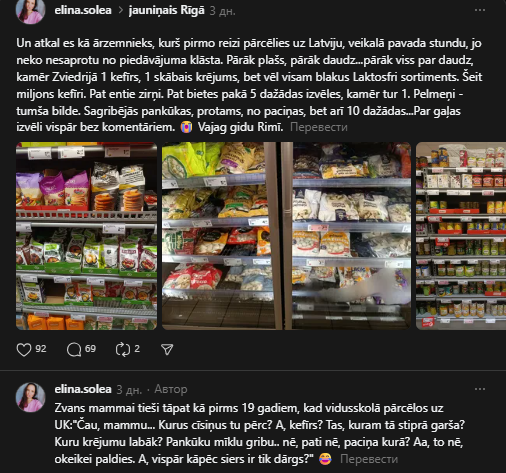В социальных сетях набирает популярность обсуждение, в котором латвийцы, проживающие за рубежом, по возвращении в Латвию, делятся своим опытом покупок в местных магазинах. Оказалось, что для многих главным испытанием становятся вовсе не цены, а чрезмерно широкий ассортимент товаров.
