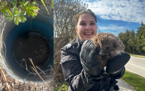 ФОТО, ВИДЕО. В закопанную трубу упал ёжик. Благодаря собаке Ляле и рижским полицейским его удалось спасти