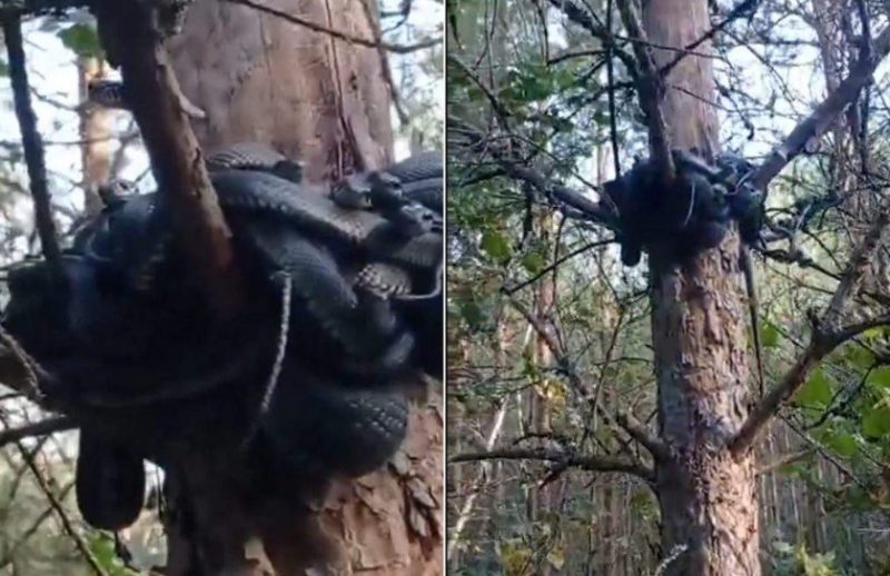 Скорее всего, ужи забрались на дерево от первых заморозков, опустившихся на и без того холодный лесной подстилок. Вверху теплее, тем более в огромном змеином клубке.