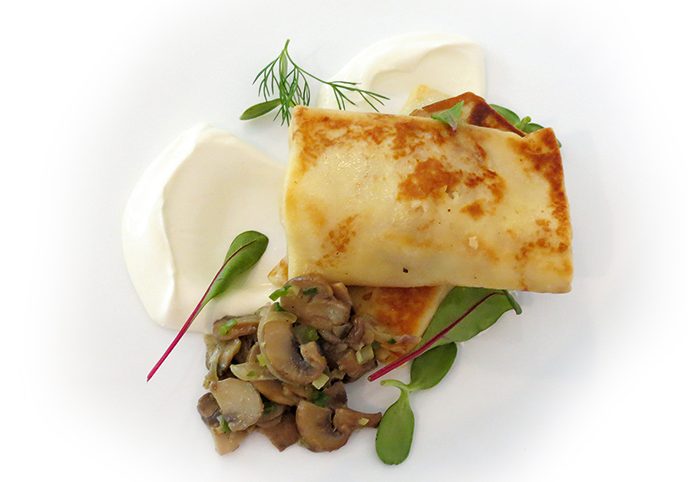 - Немного остудите начинку и выложите её на заранее приготовленные тонкие блинчики.