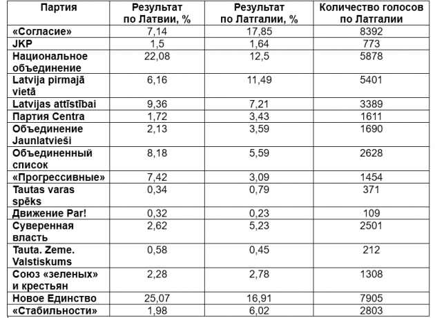 Пятипроцентный барьер по Латгалии преодолели также Latvijas attīstībai (9,36 % по Латвии), «Объединенный список» (8,18 % по Латвии), а также не получившие евромандаты «Суверенная власть» (2,62% по Латвии) и «Стабильности (1,98 % по Латвии).