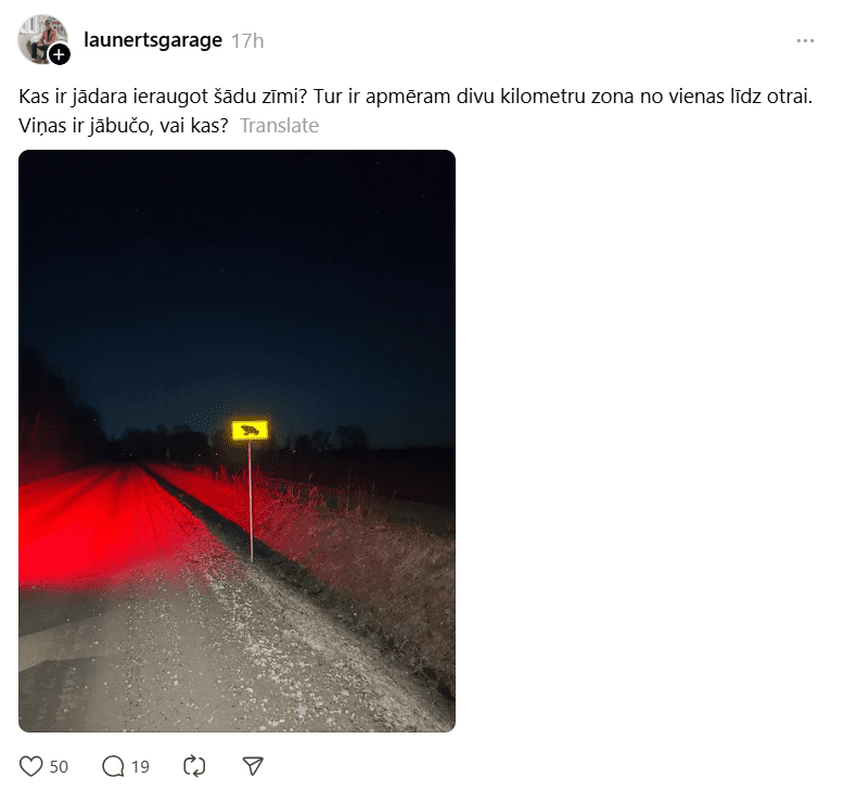 Какой-то водитель заметил на гравийной дороге необычный дорожный знак, на котором изображена жаба. «Что нужно делать, увидев такой знак? Там примерно двухкилометровая зона от одного до другого. Их нужно целовать, или что?» — спрашивает он на платформе социальных сетей «Threads».