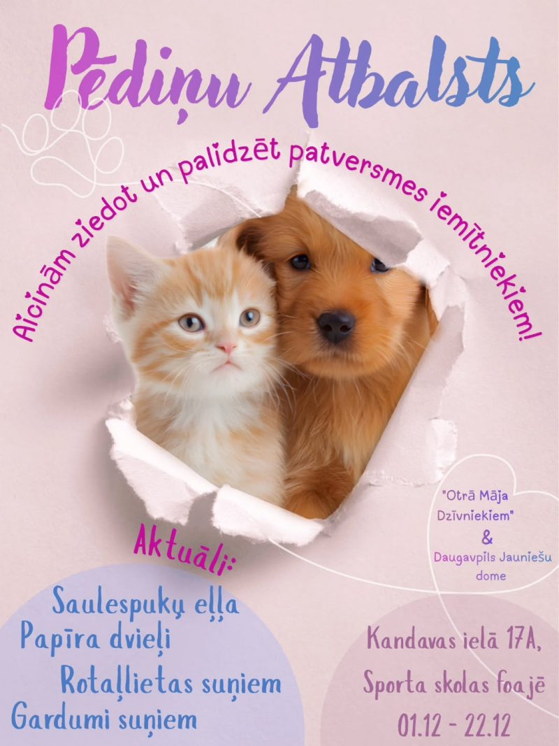 До 22 декабря Молодежная дума Даугавпилса проводит благотворительную акцию Pediņu Atbalsts, направленную на поддержку животных, находящихся в приюте Otrā Māja Dzivniekiem.
