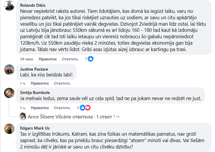 “Нельзя не согласиться с автором статьи. Тем «летунам», которые думают, что выигрывают время, могу по своему опыту сказать: вы только рискуете нарваться на штрафы, ставите под угрозу своё здоровье и здоровье окружающих, а также расходуете больше топлива. Живя в Швеции, мне нужно было проехать 550 км до порта, чтобы добраться в Латвию. Сначала я тоже «летал» 160–180 км/ч, но потом решил проверить, сколько же времени реально выигрываю, и однажды проехал этот путь, не превышая 120 км/ч. На дистанции в 550 км я потерял всего лишь 2 минуты, зато экономия топлива была заметной. Поэтому нет смысла гонять. Хочешь острых ощущений — сходи покатайся на картинге по трассе”, – написал Роландс.