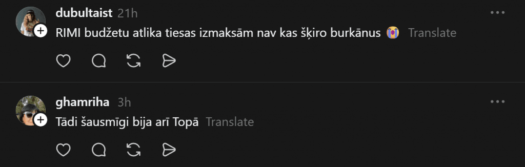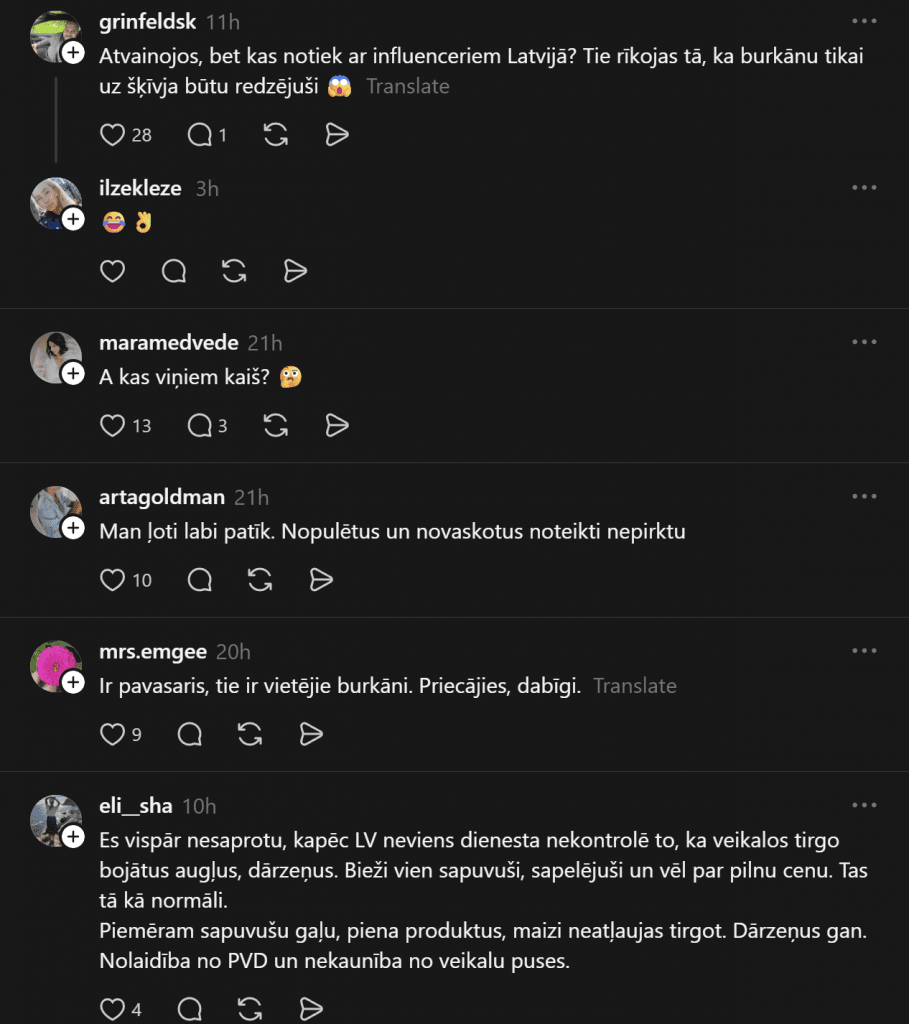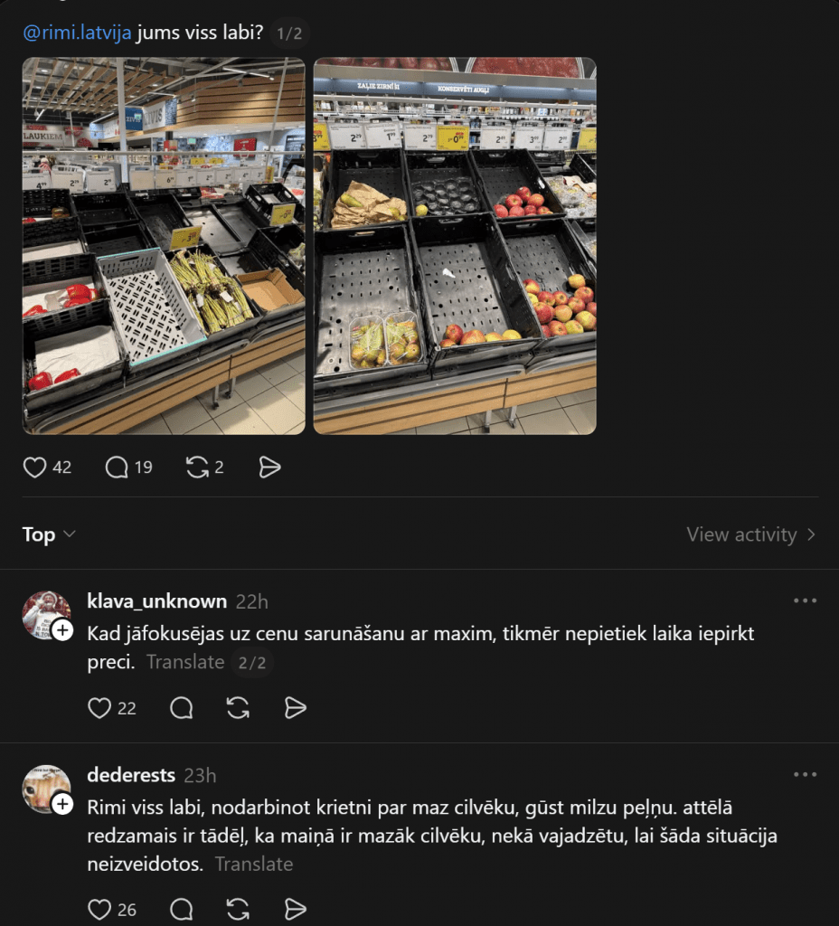 О пустых магазинных полках один из комментаторов пишет: «У Rimi всё хорошо, нанимая значительно меньше людей, чем нужно, они получают огромную прибыль. То, что видно на фото, происходит потому, что в смене меньше людей, чем должно быть, чтобы такая ситуация не возникала.»