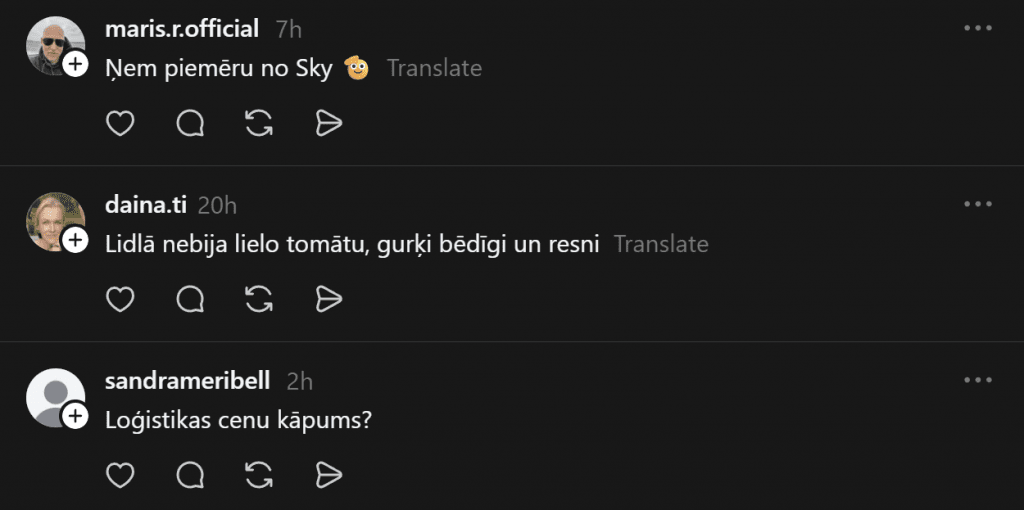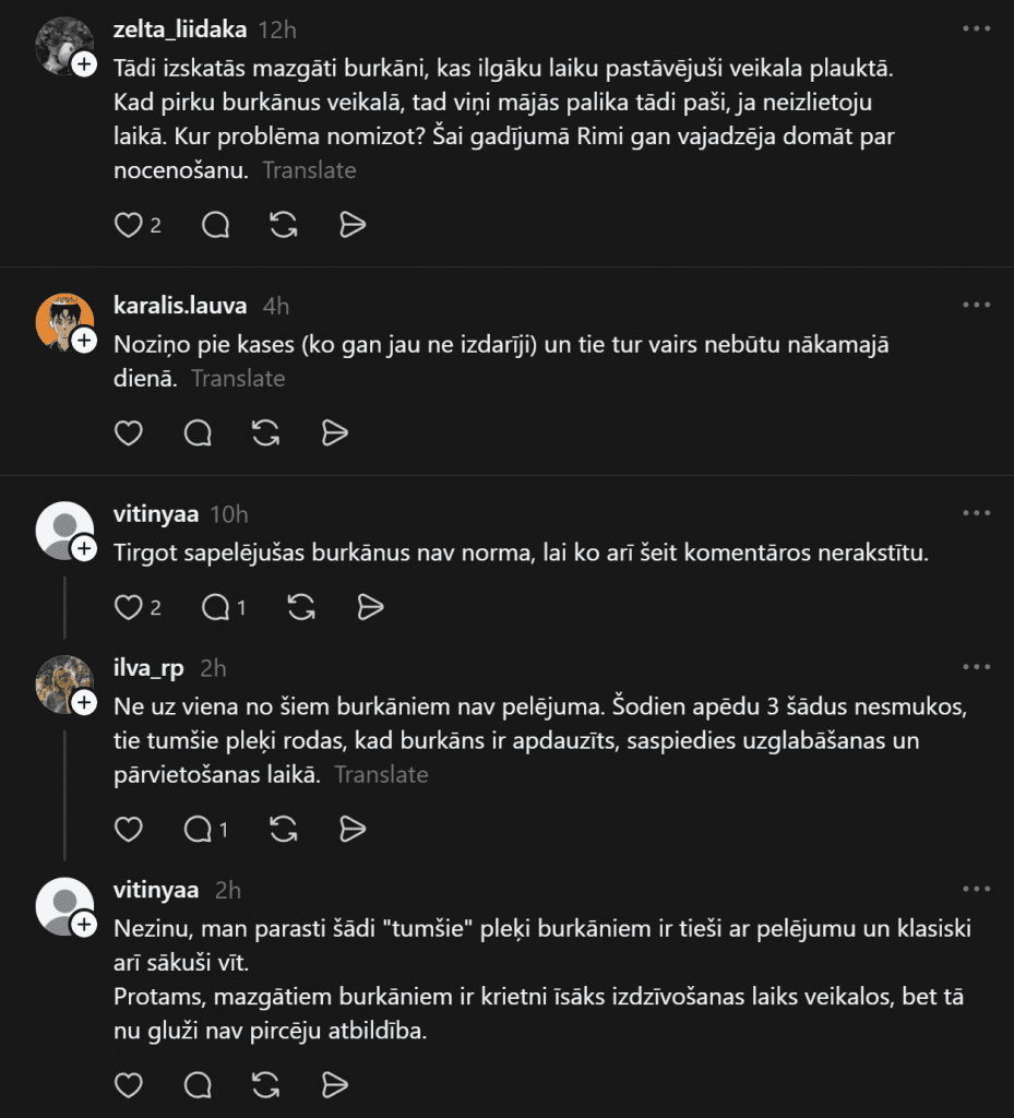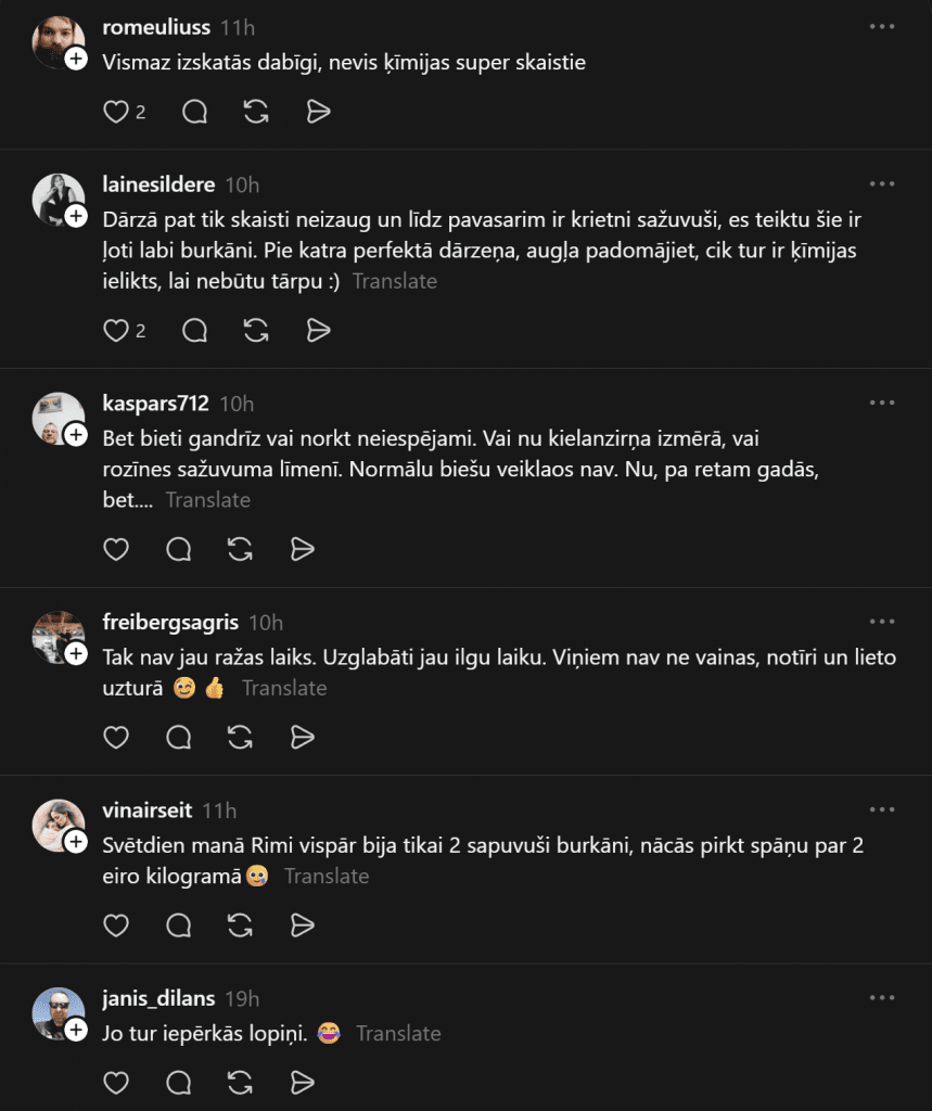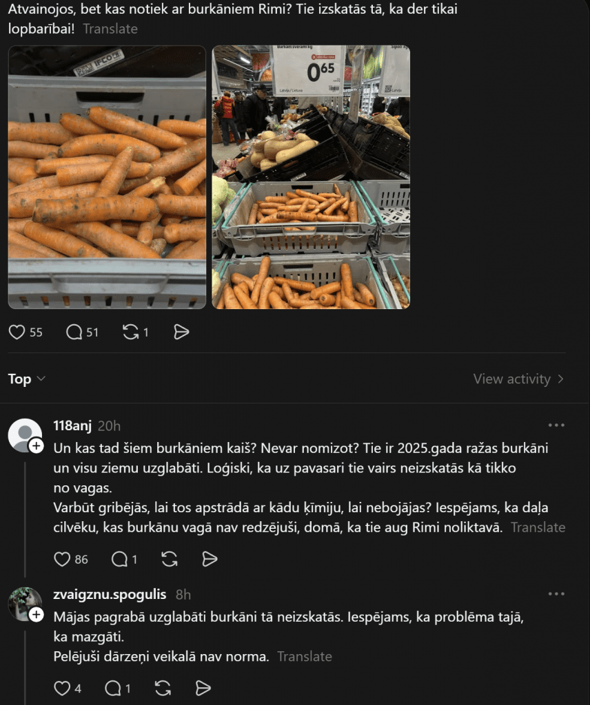 Несколько покупателей «Rimi» опубликовали фото и задали вопрос, что же на самом деле происходит в магазинах «Rimi». В одной публикации покупательница Анна указывает, что морковь на полках выглядит настолько ужасно, что годится только на корм скоту, а другой покупатель сфотографировал полупустые магазинные полки, беспокоясь, не повторяет ли «Rimi» судьбу «Sky», как в комментариях указывает один человек.