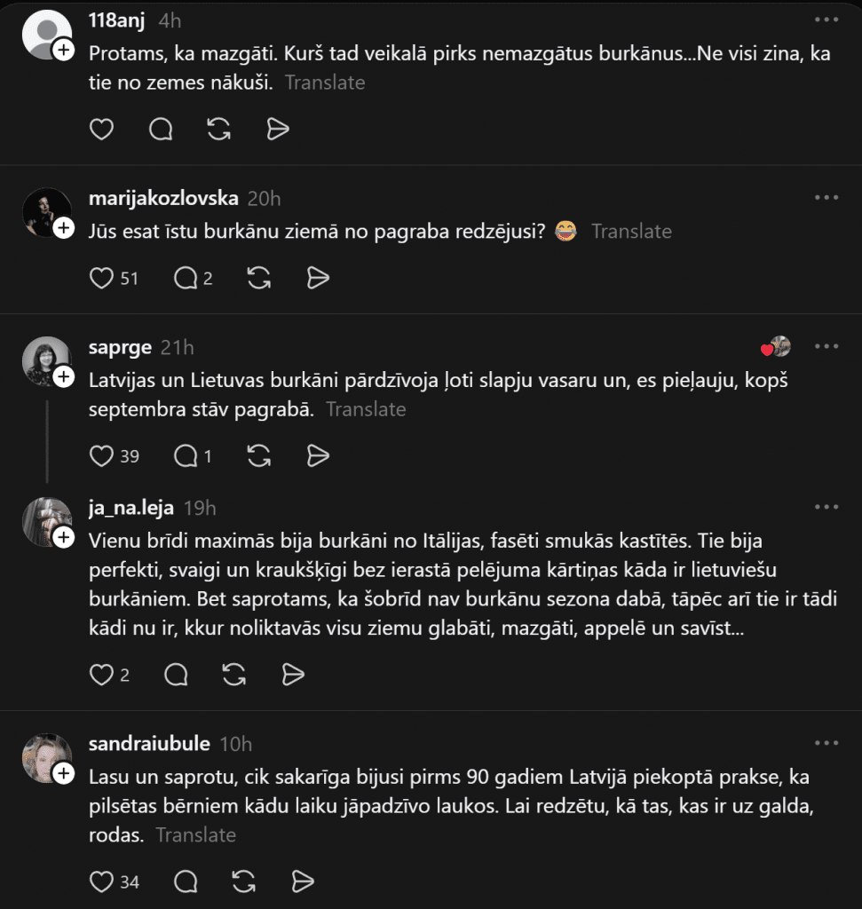 Яна вспоминает, что «одно время в Maxima была морковь из Италии, упакованная в красивые коробочки. Она была идеальной, свежей и хрустящей, без привычного слоя плесени, который бывает у литовской моркови. Но понятно, что сейчас в природе не сезон моркови, поэтому она и такая, какая есть, — где-то всю зиму хранилась на складах, мытая, покрывается плесенью и вянет…»