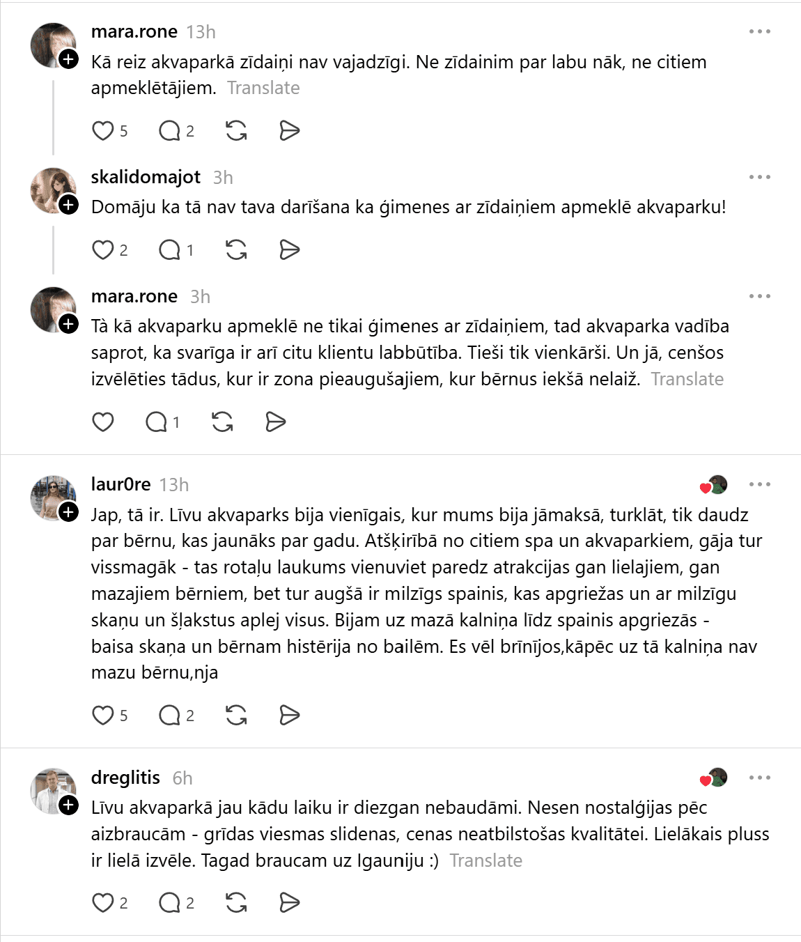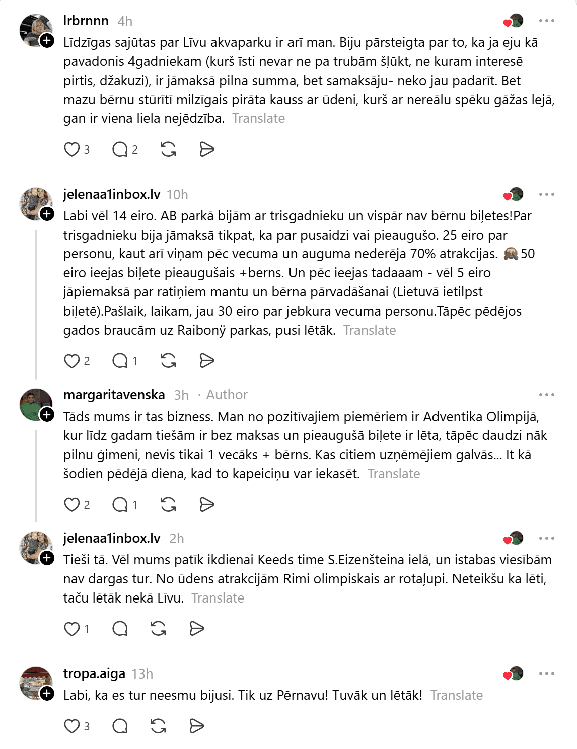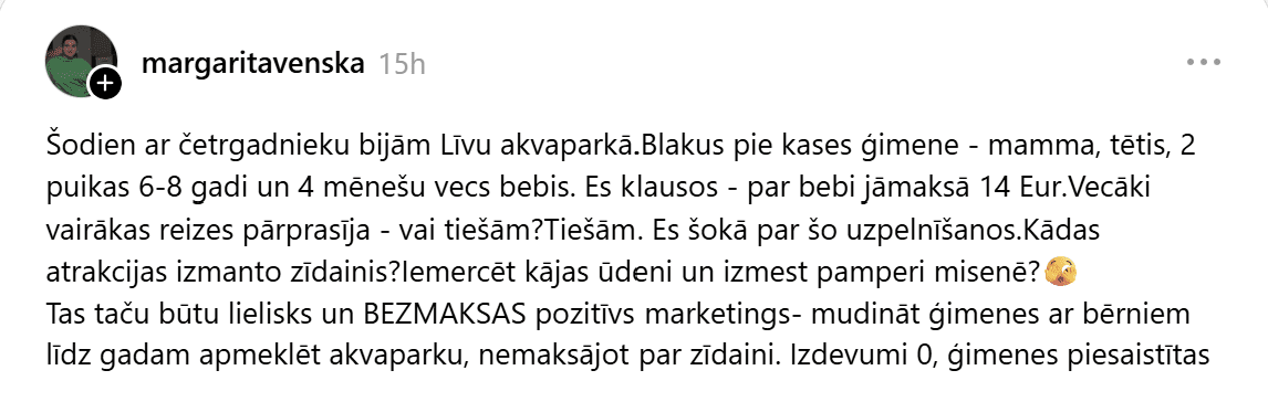 «Сегодня с четырёхлетним ребёнком были в Līvu akvaparks. Рядом у кассы семья — мама, папа, два мальчика 6–8 лет и 4-месячный малыш. Я слушаю — за малыша нужно заплатить 14 евро. Родители несколько раз переспросили: правда? Да, правда. Я в шоке от такой наживы. Какие аттракционы использует младенец? Опустить ножки в воду и выбросить подгузник в мусорку? Это ведь был бы отличный и БЕСПЛАТНЫЙ маркетинговый ход — побуждать семьи с детьми до года посещать аквапарк, не платя за младенца. Расходы 0, семьи привлечены.»