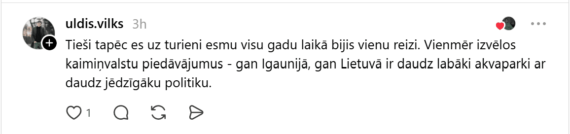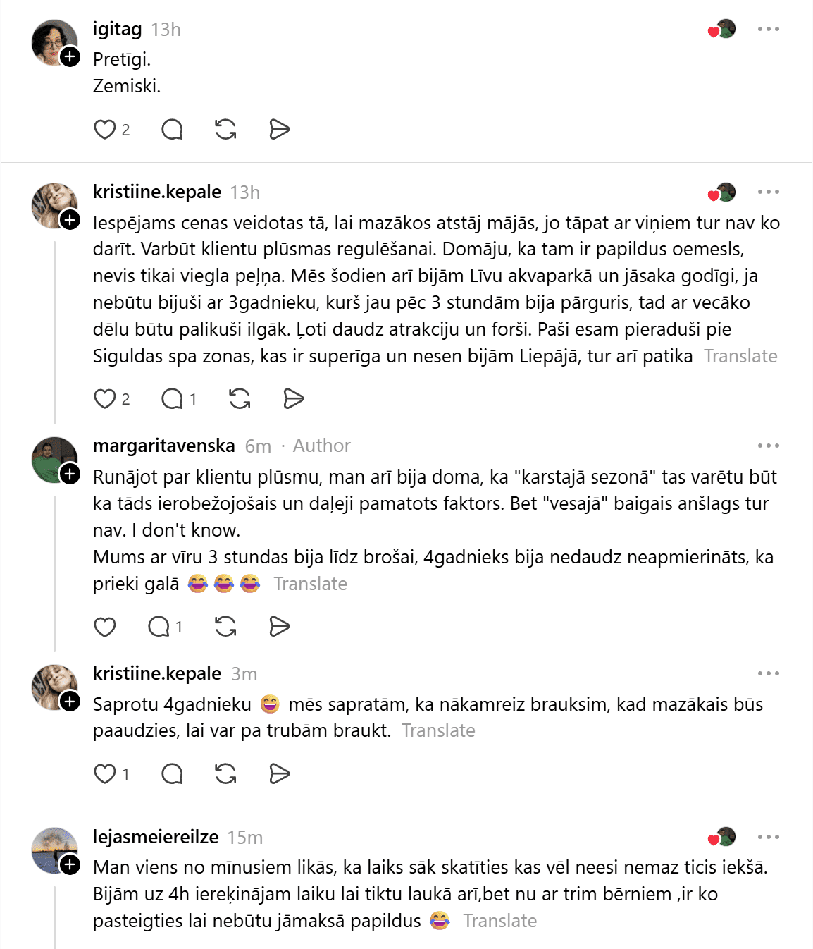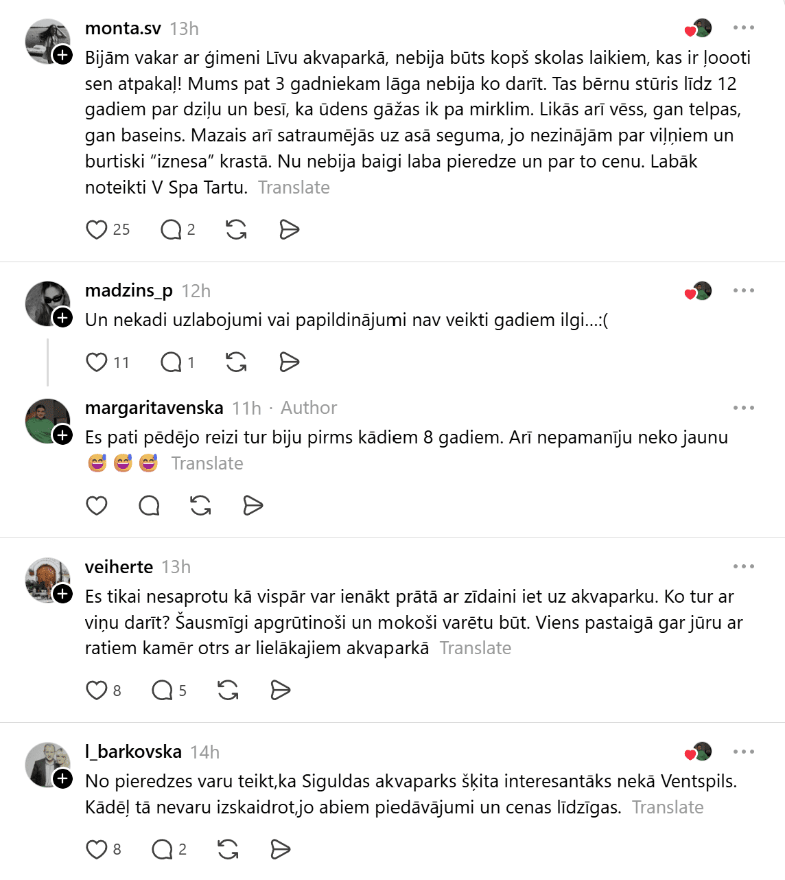 «Вчера были с семьей в «Līvu akvaparks», не были там со школьных времён, а это очень давно! Даже нашему трёхлетнему ребёнку было нечего делать. Детский уголок до 12 лет показался слишком глубоким и раздражало, что вода постоянно льётся. Казалось, что и помещения, и бассейн прохладные. Малыш ещё получил травму на остром покрытии, потому что мы не знали про волны, и его буквально “выкинуло” на берег. В общем, опыт не очень хороший, особенно за такую цену. Определённо лучше в Spa в Тарту.»