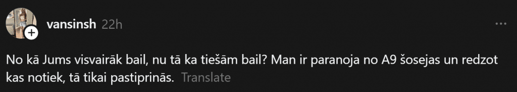 Как известно, аварии на этой автодороге не редкость. Например, совсем недавно произошло столкновение пяти грузовых транспортных средств. Об этом свидетельствуют и мнения других людей, которые присоединяются к словам Кристине о страхах. Например, Илзе делится развёрнутым мнением. Она пишет: “Я не пользуюсь A9, лучше сделаю небольшой крюк по дорогам второй или третьей категории, особенно если в машине ребёнок. Я могу ехать настолько безопасно, насколько вообще возможно, но если навстречу поедет идиот или пьяный водитель, исход может быть пугающим. К тому же, как известно, идиоты часто отделываются царапинами.”