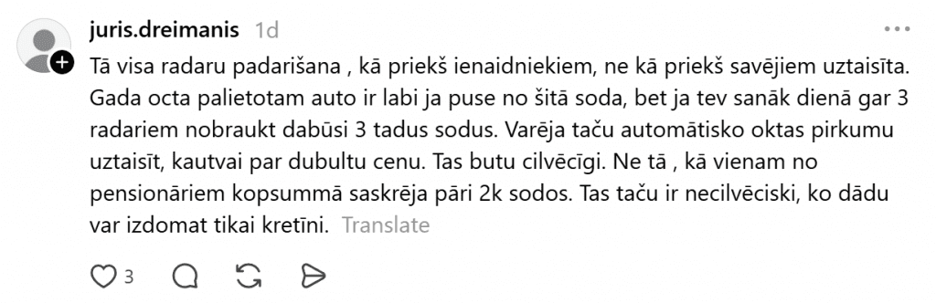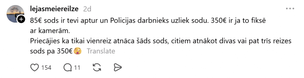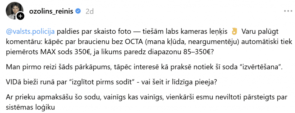 Водитель, признавая свою вину, поделился снимком с фоторадара и обратился с вопросом к Государственной полиции: «Почему за поездку без OCTA автоматически применяется максимальный штраф, если закон предусматривает диапазон штрафа от 85 до 350 евро?»