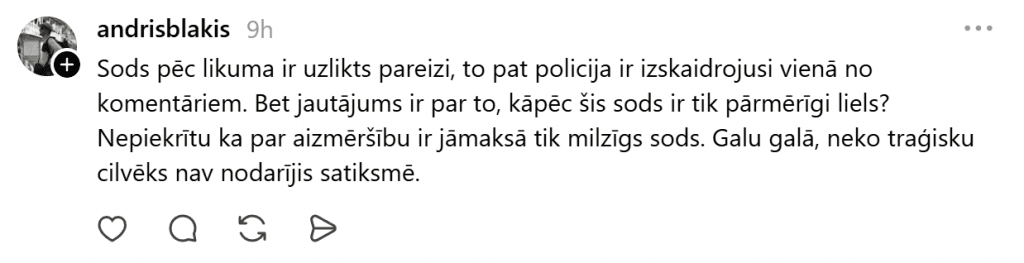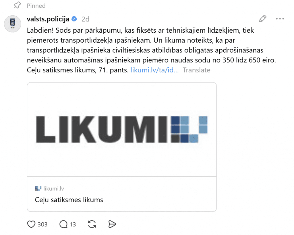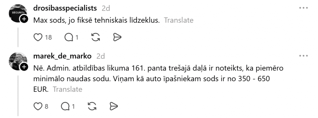 Представители Государственной полиции дали разъяснение: «Штраф за нарушение, зафиксированное техническими средствами, применяется к владельцу транспортного средства. И законом установлено, что за отсутствие обязательного страхования гражданско-правовой ответственности владельца транспортного средства к владельцу автомобиля применяется денежный штраф от 350 до 650 евро. Закон о дорожном движении, статья 71».