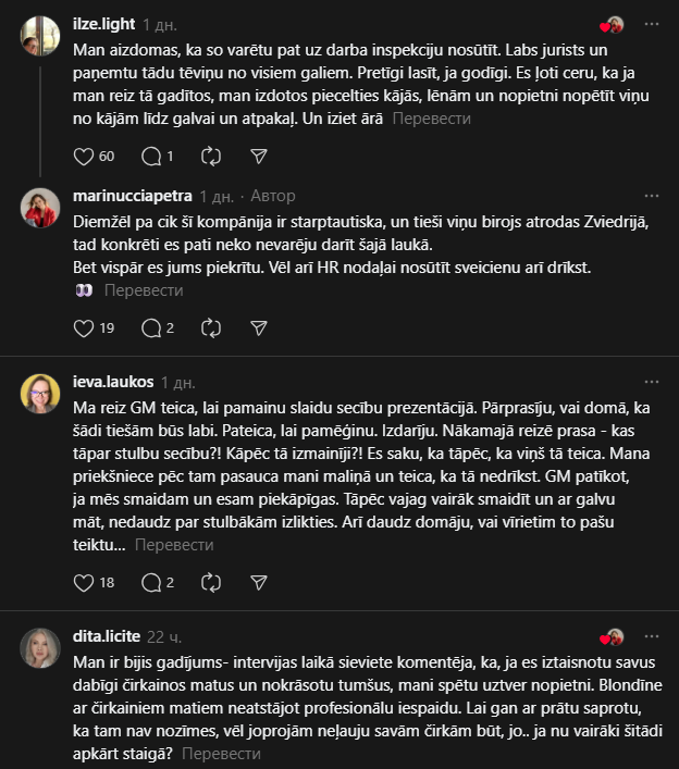 «Со мной тоже был случай на собеседовании в Латвии, в международной компании, где меня высмеяли два британских джентльмена. Мне тогда было 30 лет, рядом была HR-представительница, которая пыталась спасти ситуацию. В тот момент я бы, наверное, вежливо закончила интервью и ушла. Тогда я была слишком молода для этого. Но в целом в международной среде большинство мужчин зрелые и их интересует профессиональная компетенция, а не внешний вид».
