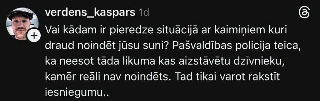 «Есть ли у кого-то опыт в ситуации с соседями, которые угрожают отравить вашу собаку? Муниципальная полиция сказала, что нет такого закона, который защищал бы животное, пока его реально не отравили. Только тогда можно будет писать заявление..» — спрашивает у окружающих на сайте “Threads” Каспарс. Он указывает, что угрозы высказала 70-летняя дама.