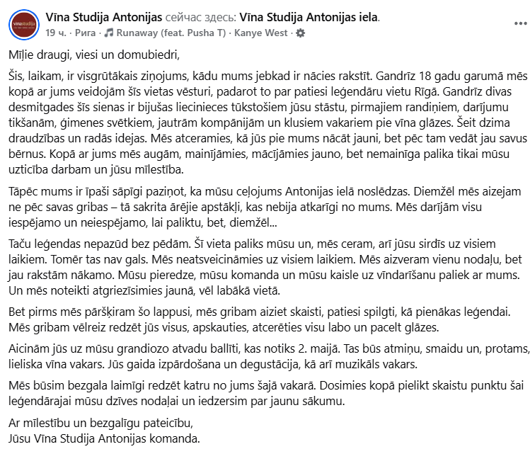 Команда заведения «Vīna Studija Antonijas» сообщила на своей странице в Facebook, что вынуждена завершить работу не по собственной инициативе — на решение повлияли внешние обстоятельства. Несмотря на попытки сохранить место, продолжить деятельность по прежнему адресу не удалось.