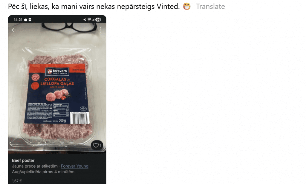 «После этого, кажется, меня уже ничто не удивит на “Vinted”», — пишет одна из пользовательниц социальной сети “Threads”, реагируя на очередное необычное объявление на популярной платформе по продаже подержанной одежды. На этот раз удивление вызвало предложение приобрести продукт из свиного и говяжьего фарша бренда “Forevers” — вещь, которая кажется совершенно вне привычного фокуса платформы на одежде и аксессуарах.