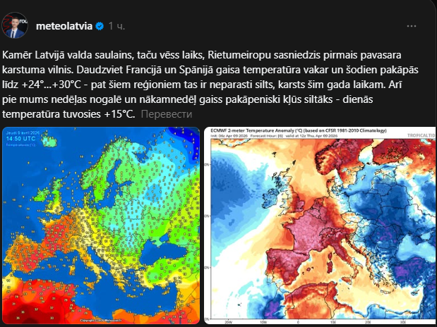 Пока в Латвии сохраняется солнечная, но прохладная погода, страны Западной Европы уже столкнулись с первой волной весенней жары. Об этом в своем блоге в соцсети “Threads” сообщил редактор прогноза погоды на канале TV3 Мартин Бергштейн, комментируя текущую синоптическую ситуацию в регионе.