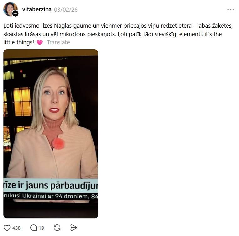 В эту — цифровую — эпоху люди стали уделять всё больше внимания деталям и всё чаще публикуют свои наблюдения в социальных сетях. Недавно особое внимание и даже признание на платформе социальных сетей “Threads” заслужила журналистка Илзе Нагла. Внимание людей привлёк её визуальный образ.