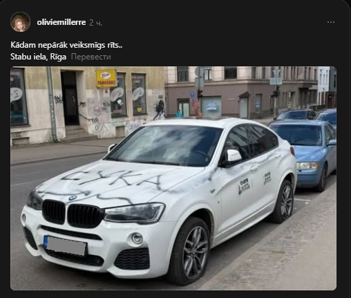 В Риге на улице Стабу заметили белый автомобиль BMW, у которого оказались спущены все четыре колеса. Кроме того, на кузове машины оставлены надписи с помощью баллончика “Су*а” и “Олеся, шл*ха” с номером телефона, что вызвало бурное обсуждение в соцсетях.