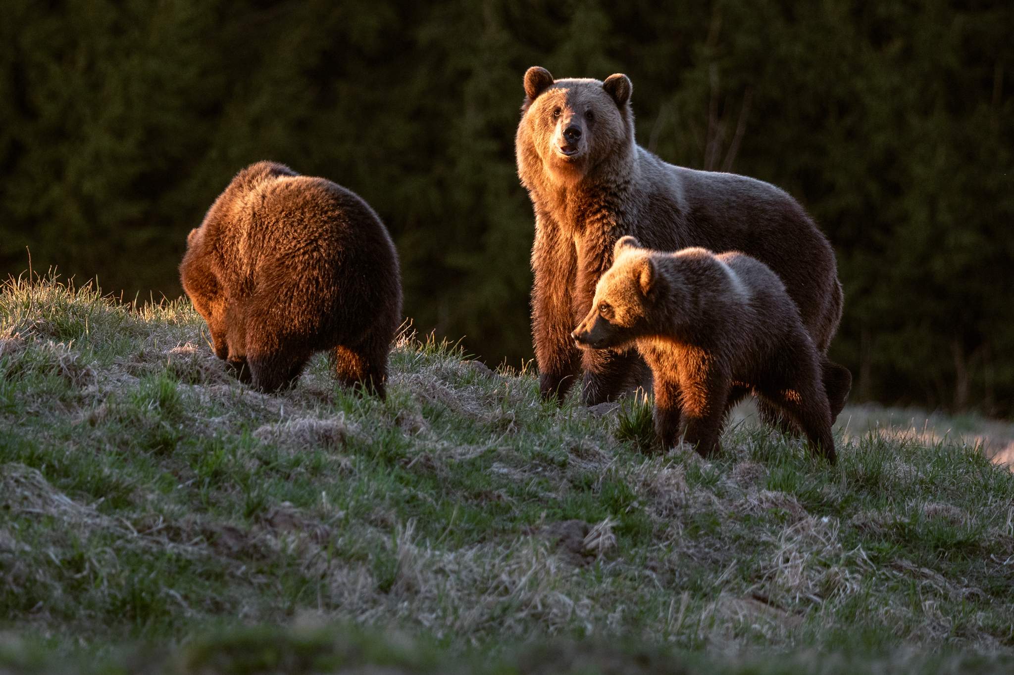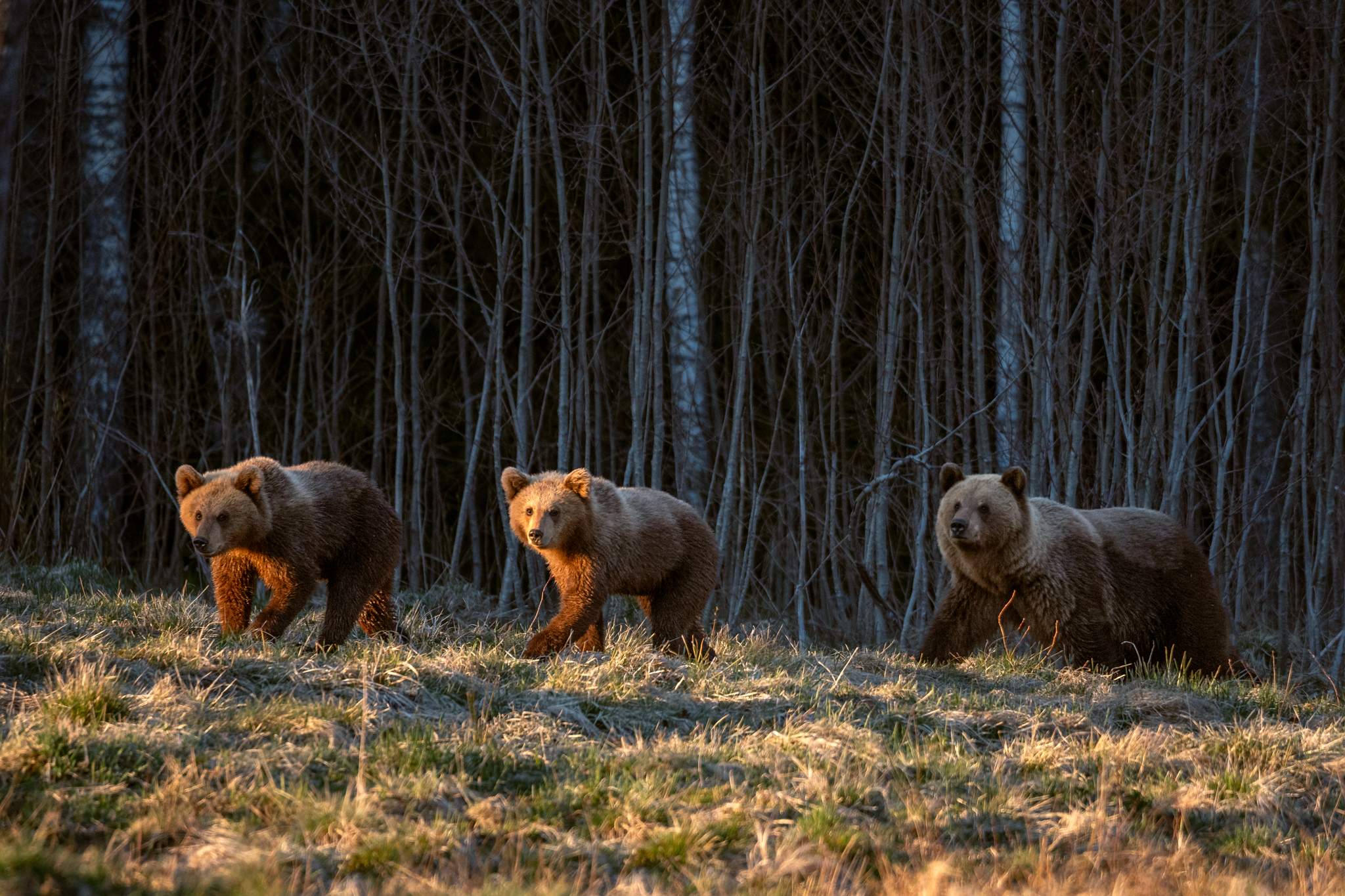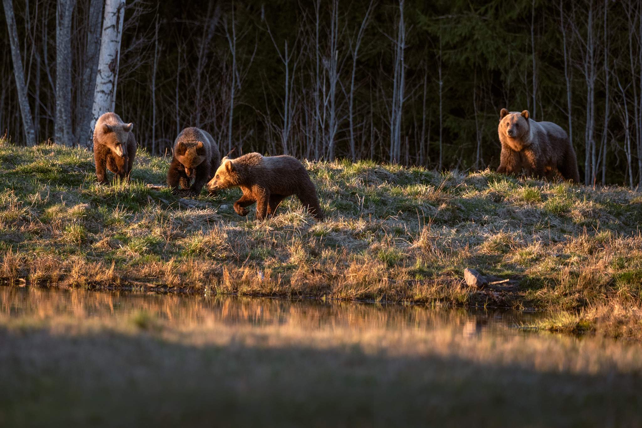 Сначала, ещё днём, через поляну быстро прошёл молодой медведь. Потом ещё один молодой. А затем, ближе к закату, произошло нечто действительно особенное, даже трудно описать эти ощущения, потому что из леса вышел маленький медвежонок. А за ним последовал ещё один, и ещё один… и их мама. Медведица с тремя малышами.