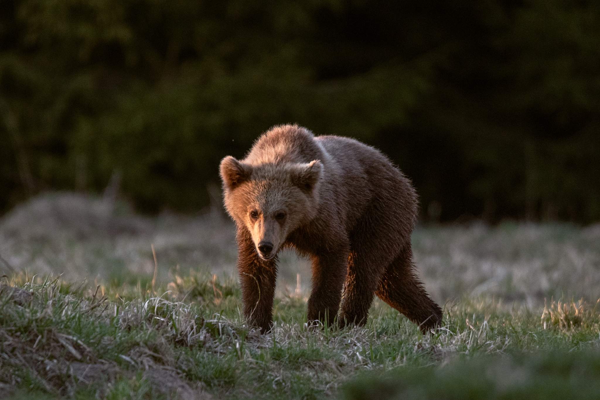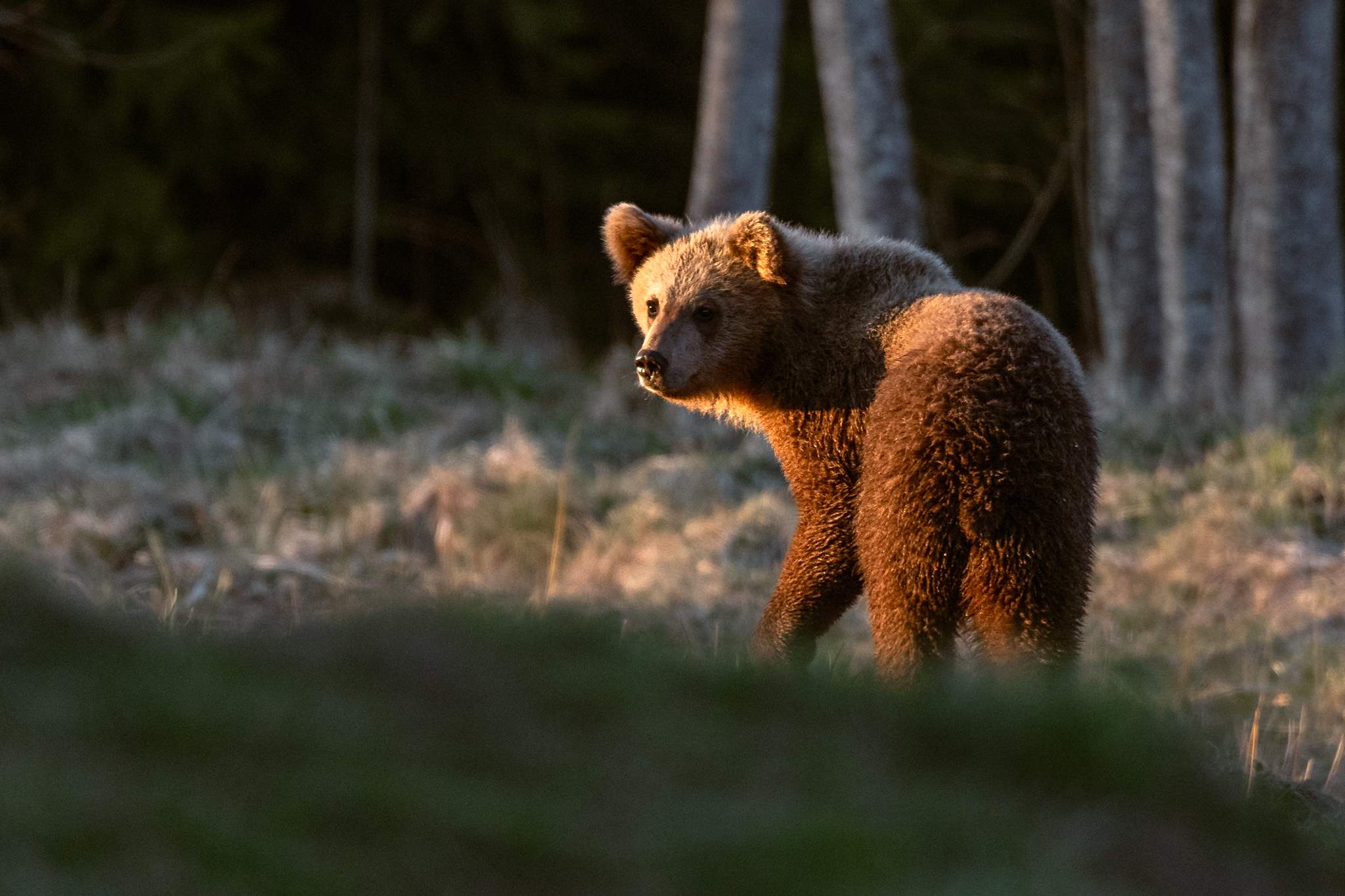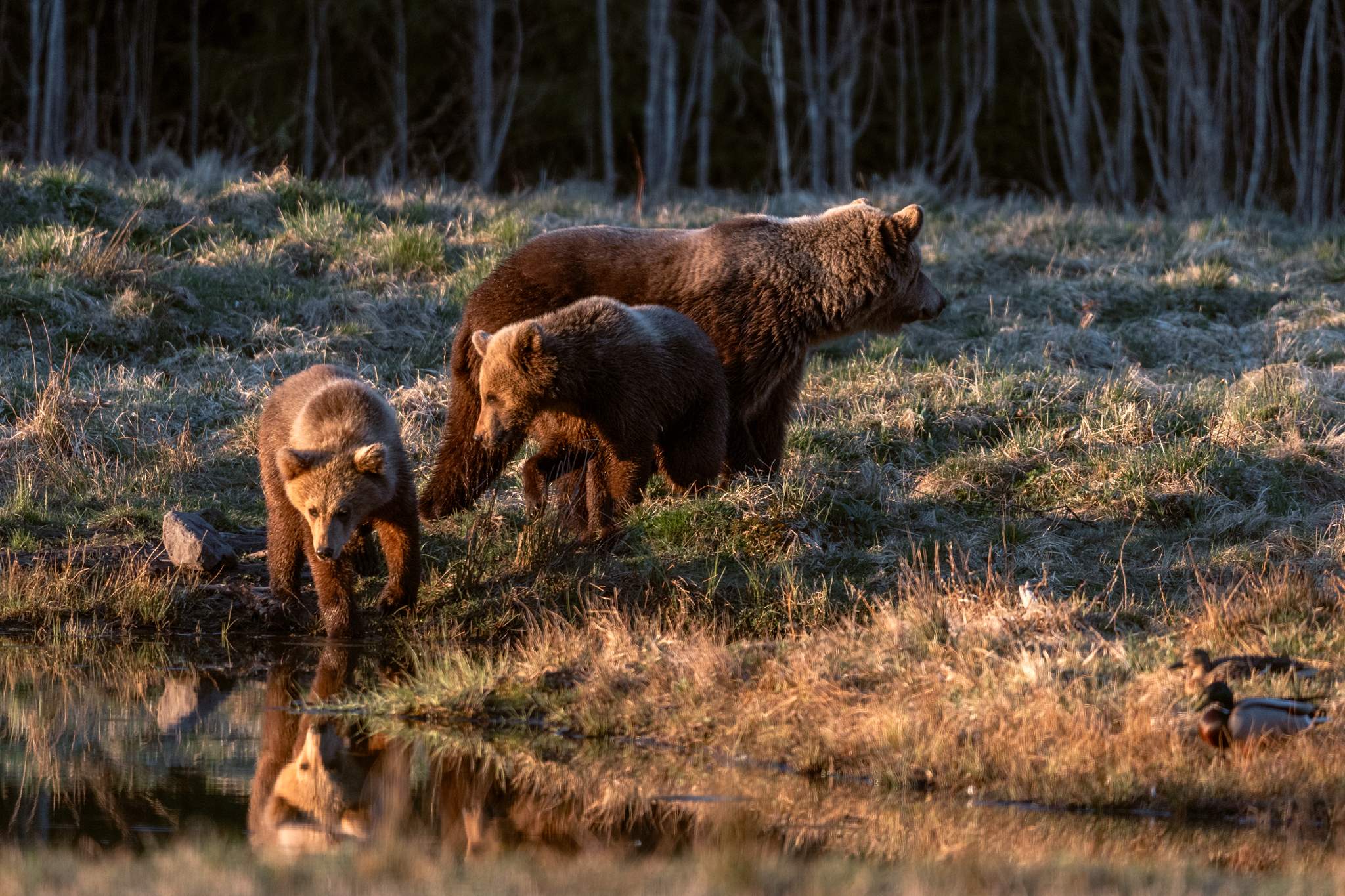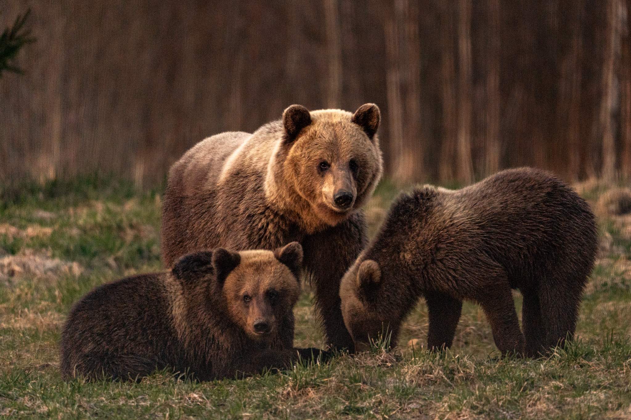 Сначала, ещё днём, через поляну быстро прошёл молодой медведь. Потом ещё один молодой. А затем, ближе к закату, произошло нечто действительно особенное, даже трудно описать эти ощущения, потому что из леса вышел маленький медвежонок. А за ним последовал ещё один, и ещё один… и их мама. Медведица с тремя малышами.