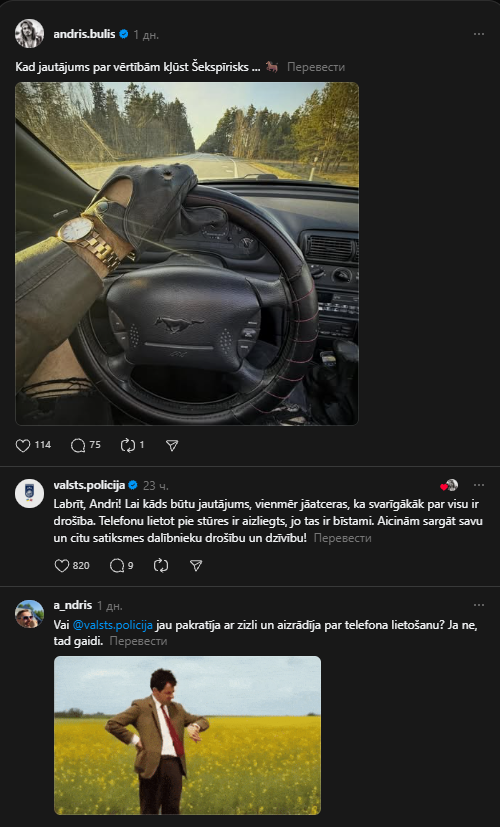 В латвийском сегменте соцсети “Threds” вызвал активное обсуждение пост актёра Андриса Булиса, который опубликовал фотографию с ироничной подписью о «шекспировских вопросах ценностей». Сделал он снимок будучи за рулем автомобиля Ford Mustang, культового американского спортивного автомобиля производства Ford Motor Company, выпускающийся с 1964 года.