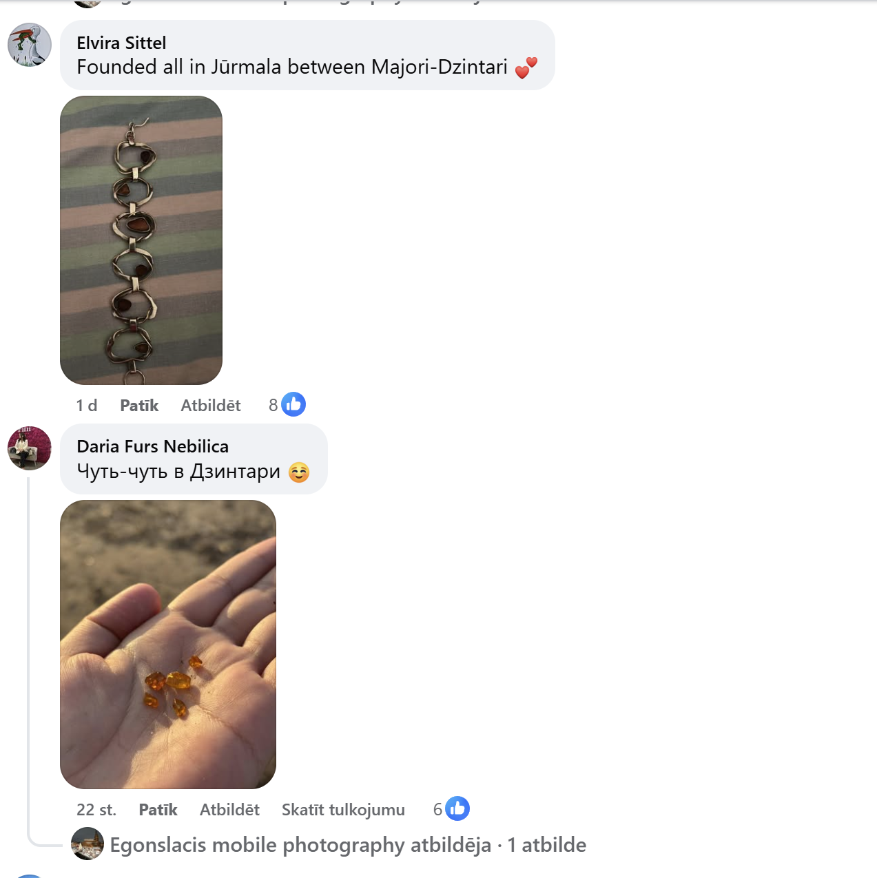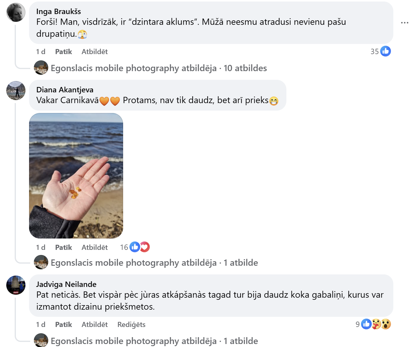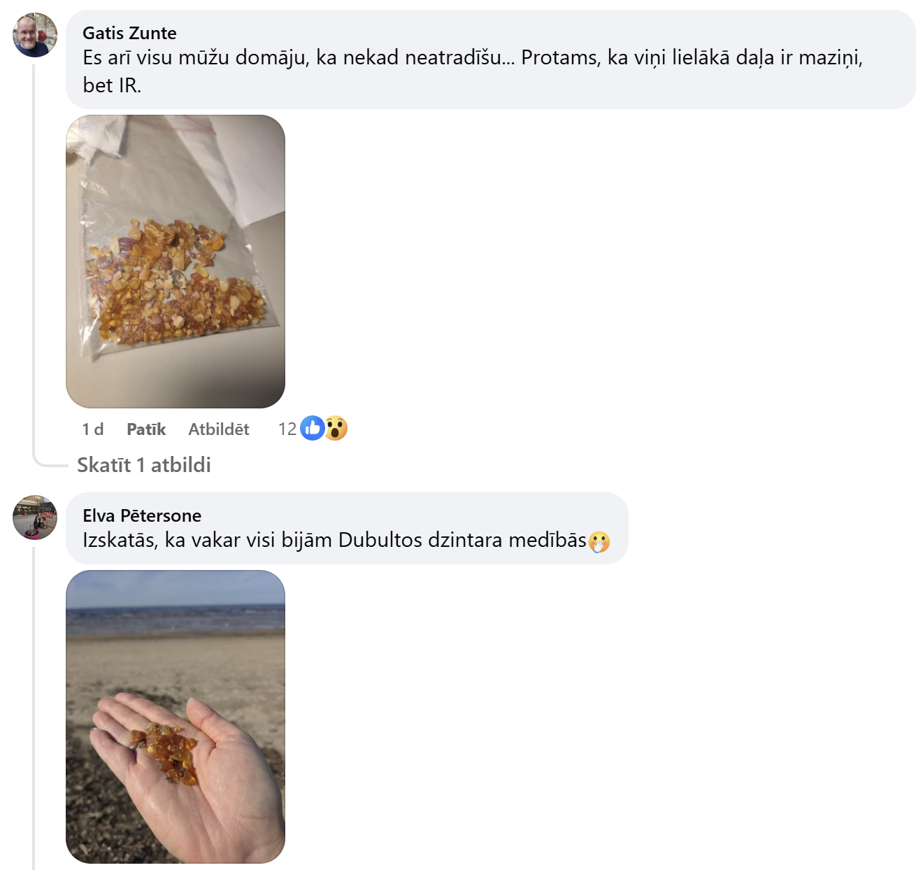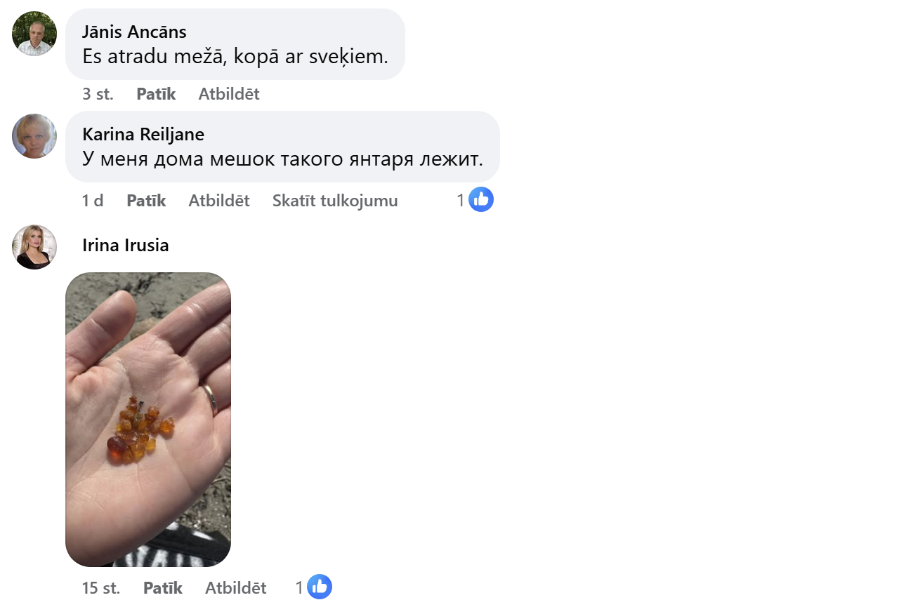 Особенно активной была юрмальская сторона — в комментариях чаще всего упоминаются пляжи Майори, Дзинтари, Дубулты. Некоторые даже шутят, что «вчера мы все были на охоте за янтарём», и фотографии это только подтверждают. В горстях видны и мелкие кусочки, и удивительно крупные находки, которые выделяются прозрачным янтарным цветом.