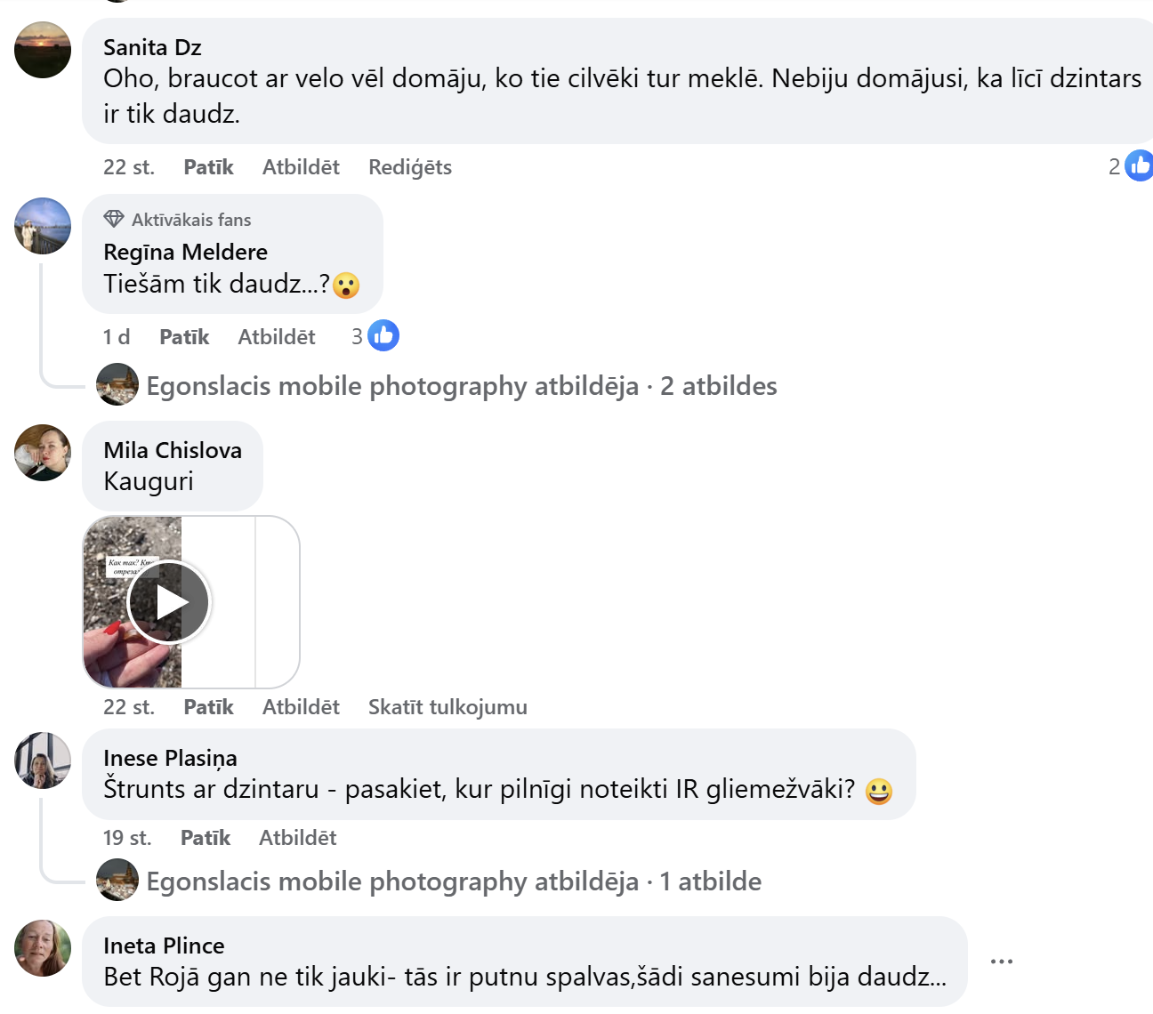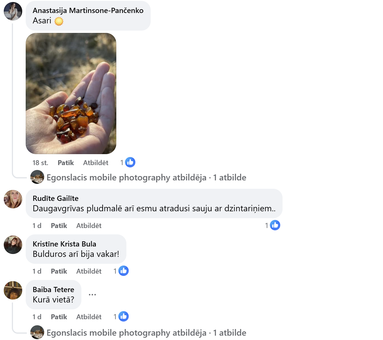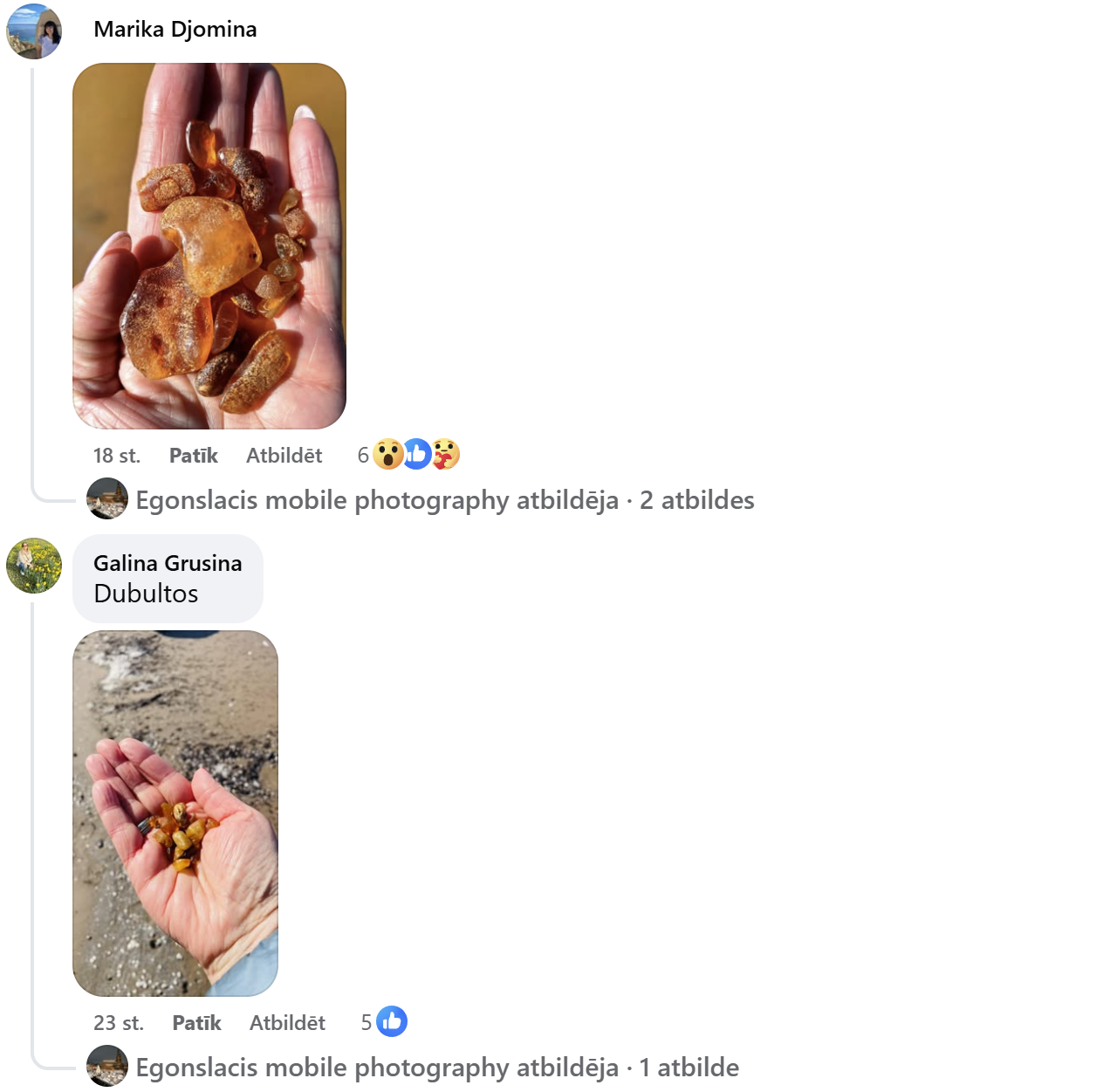 Особенно активной была юрмальская сторона — в комментариях чаще всего упоминаются пляжи Майори, Дзинтари, Дубулты. Некоторые даже шутят, что «вчера мы все были на охоте за янтарём», и фотографии это только подтверждают. В горстях видны и мелкие кусочки, и удивительно крупные находки, которые выделяются прозрачным янтарным цветом.