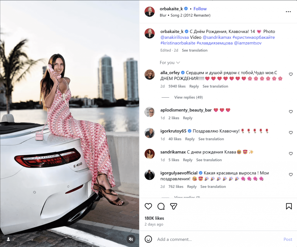 К поздравлениям присоединилась и знаменитая бабушка Клавдии — Алла Пугачёва, которая написала в комментариях: «Сердцем и душой я с тобой, моё чудо! С днём рождения».