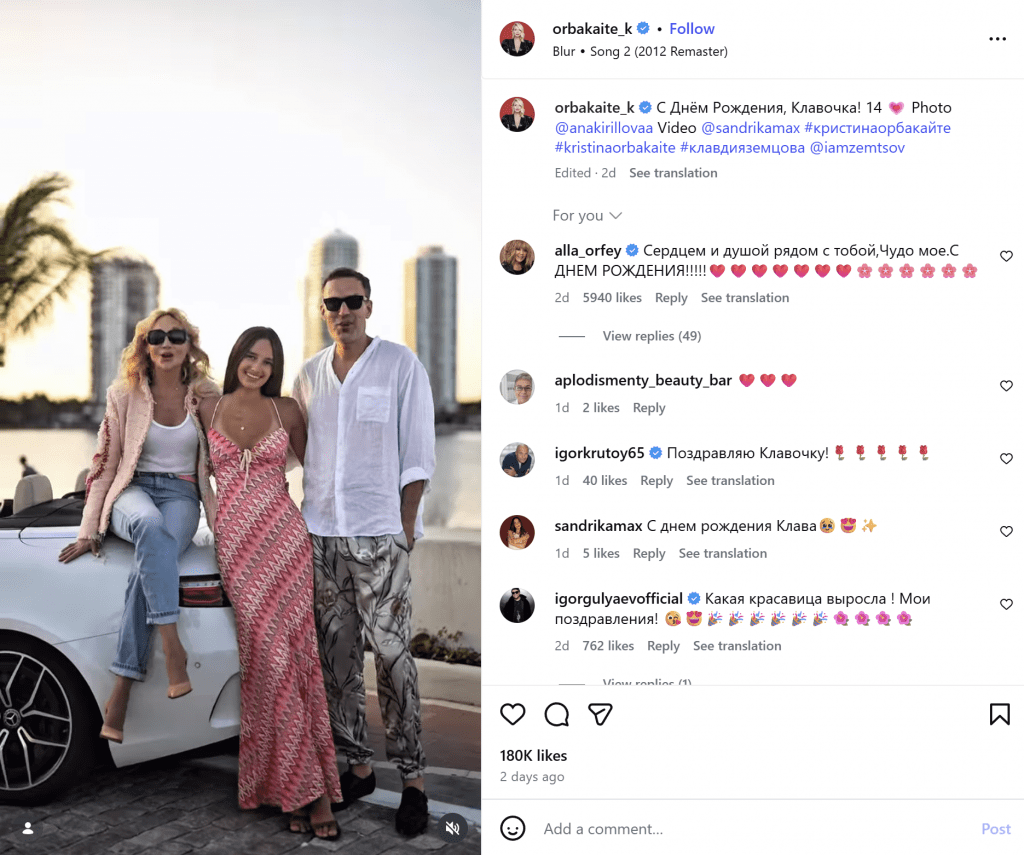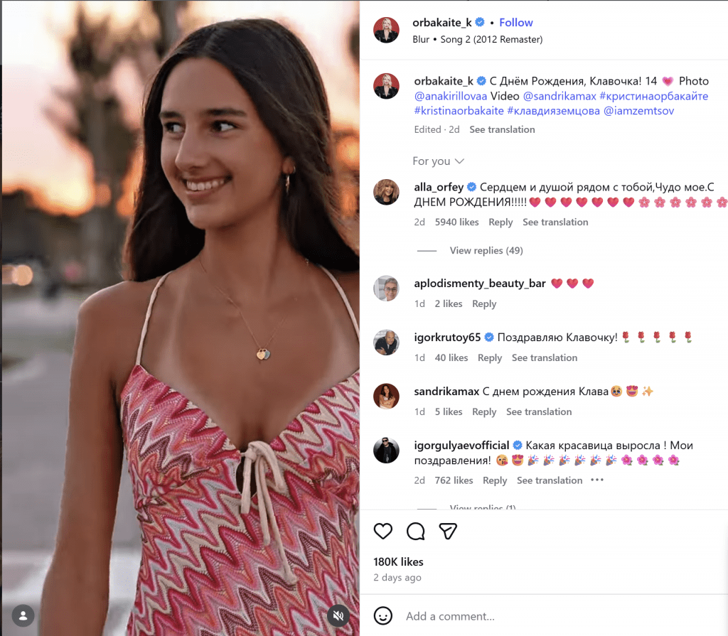В честь этого особенного события Кристина поделилась в своём аккаунте в Instagram трогательным видео, на котором она запечатлена вместе со своим мужем и именинницей. Видео передаёт семейную близость и праздничное настроение, царившее в этот день. Публикация быстро привлекла внимание подписчиков Кристины, и в комментариях люди поспешили поздравить именинницу.
