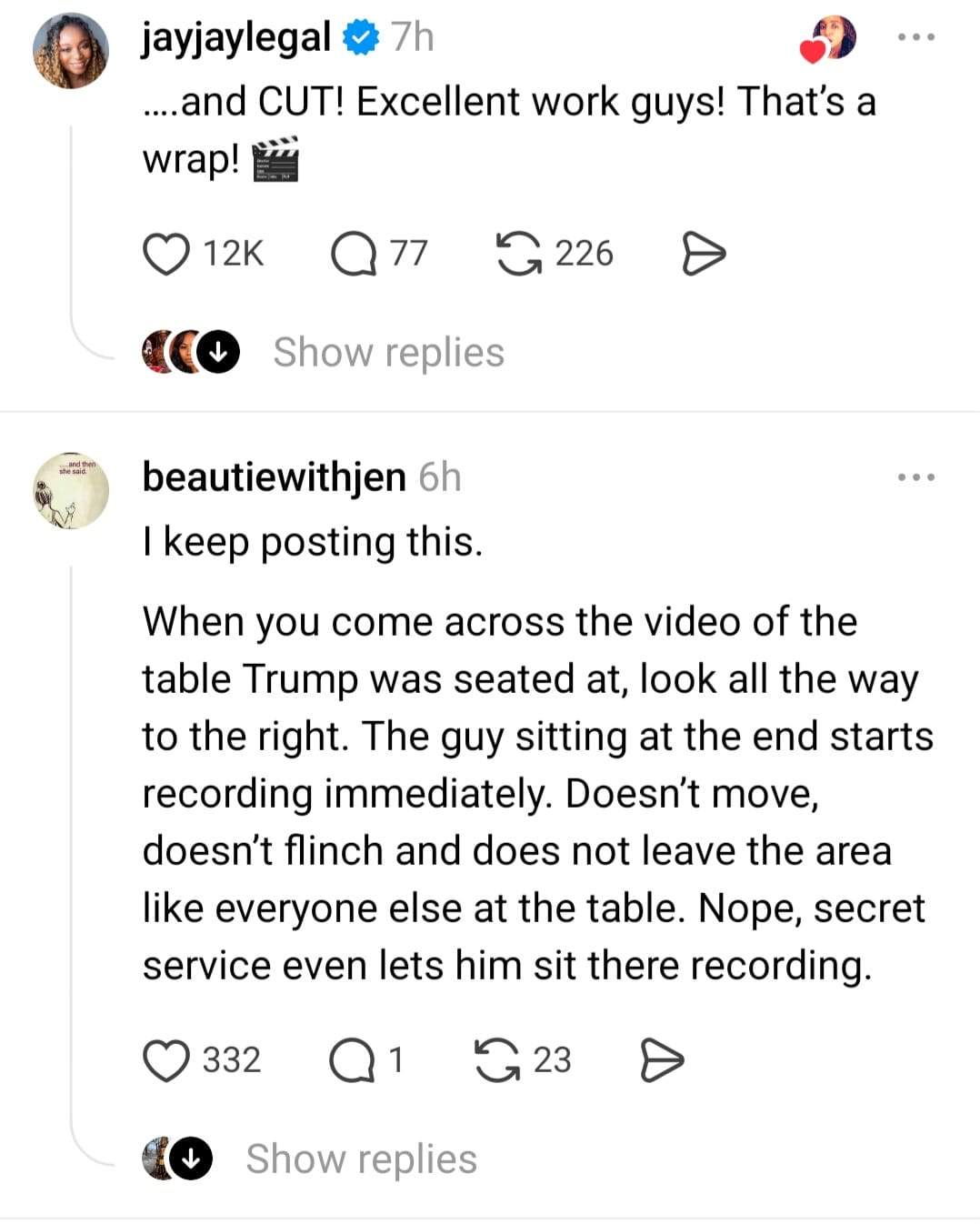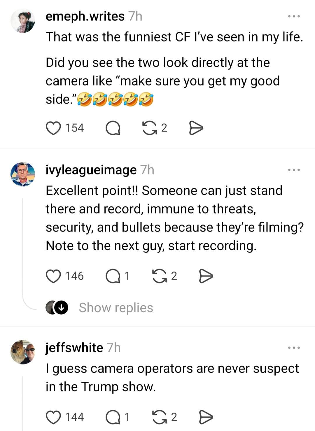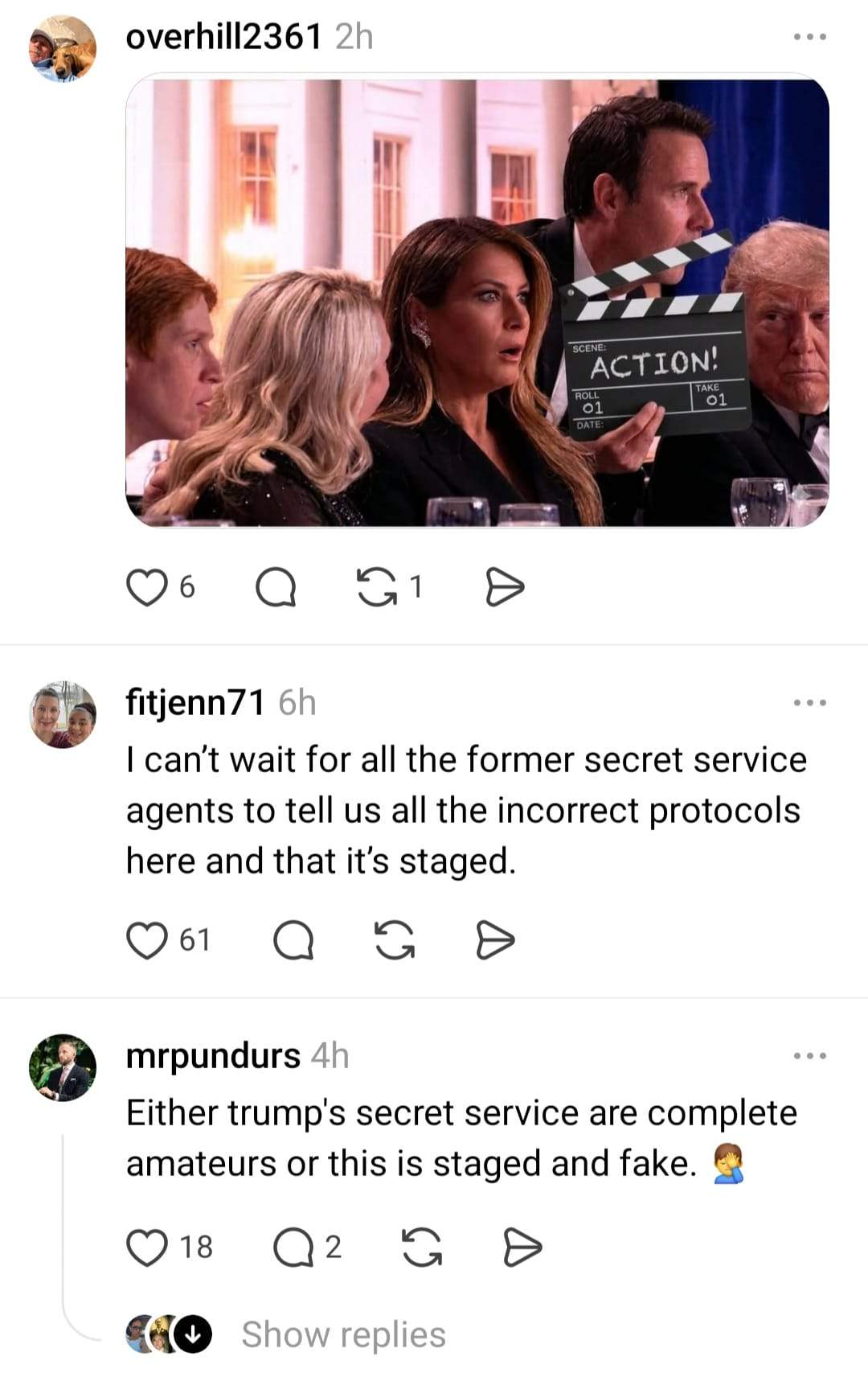 ФОТО, ВИДЕО. «Всем нужно эвакуироваться, а операторам — нет?» Всего через пару часов после стрельбы на мероприятии Трампа многие называют это постановочным цирком 0