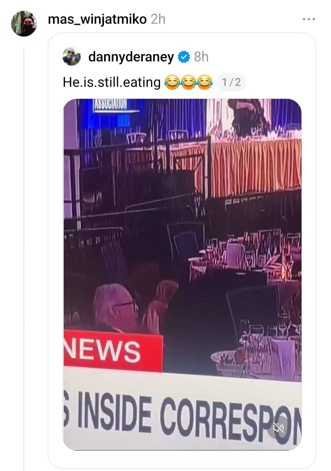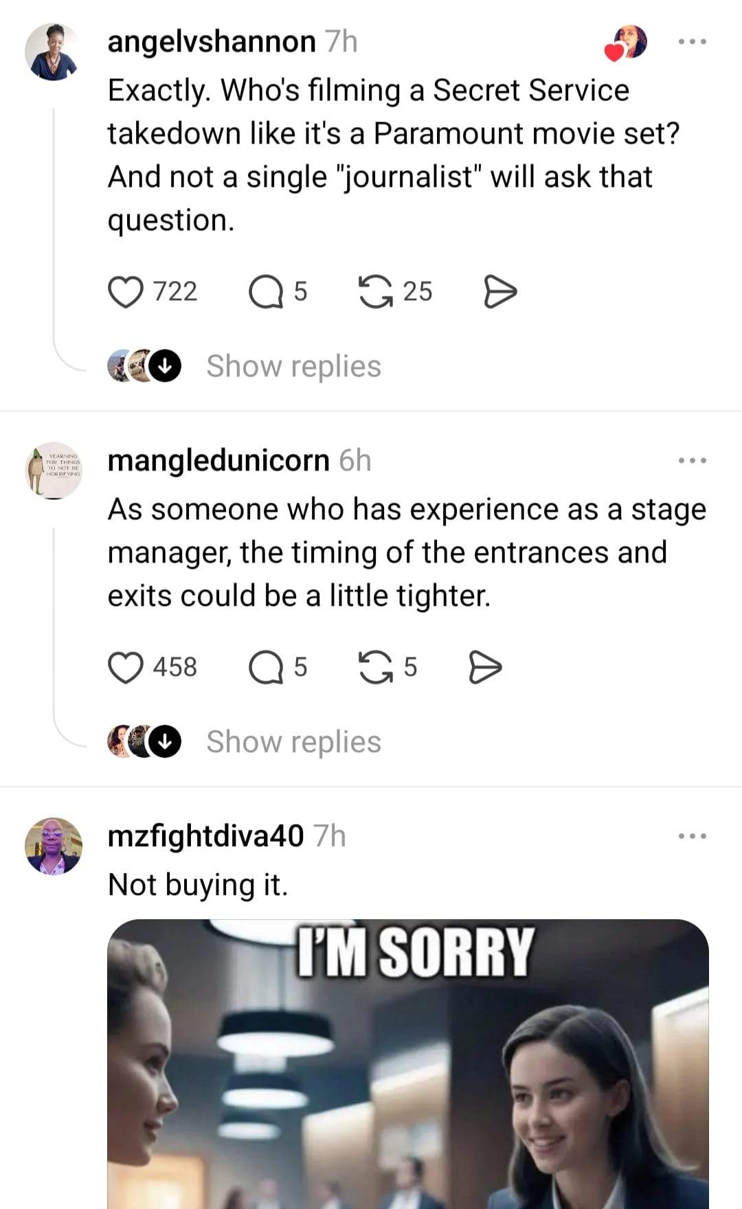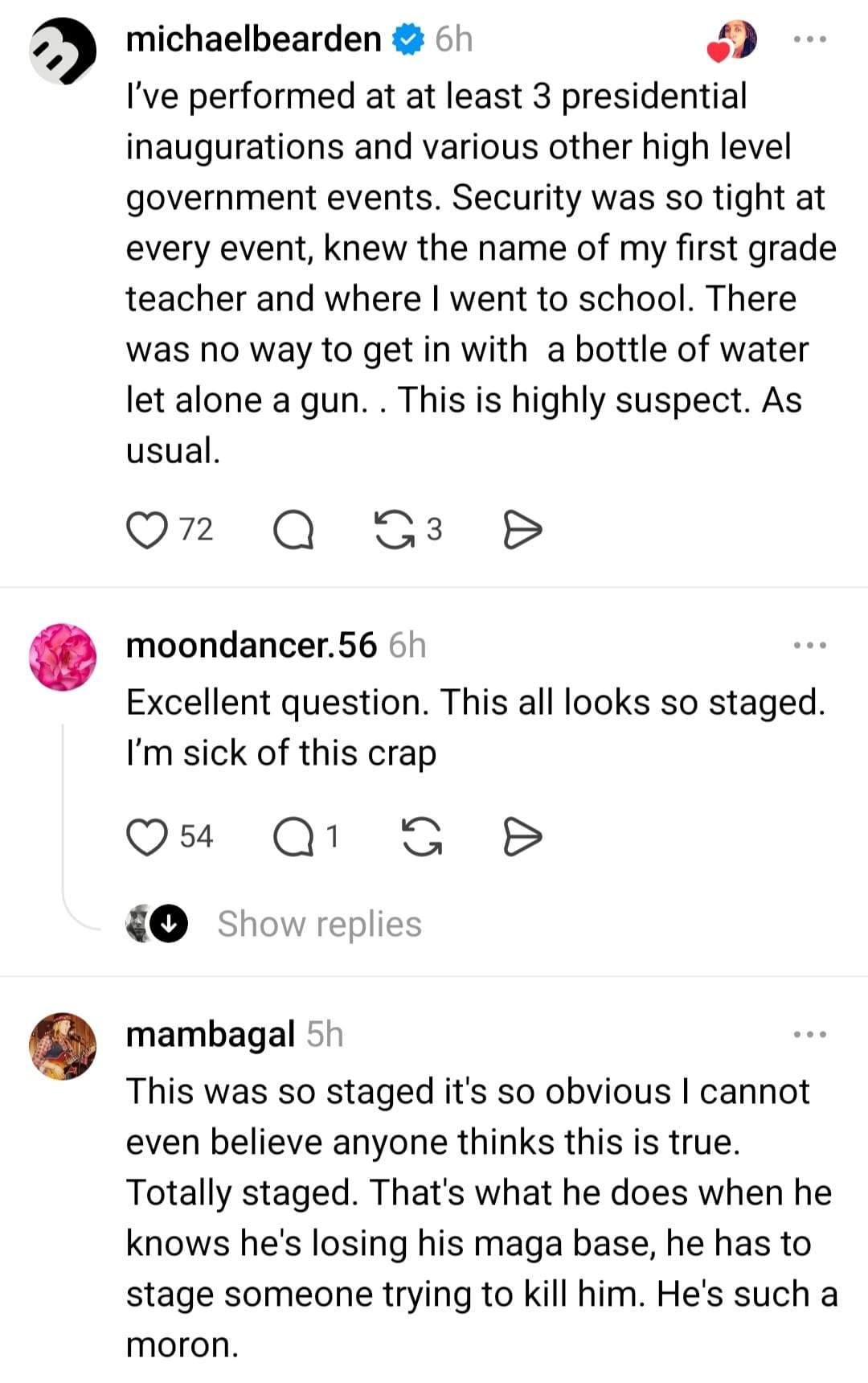 ФОТО, ВИДЕО. «Всем нужно эвакуироваться, а операторам — нет?» Всего через пару часов после стрельбы на мероприятии Трампа многие называют это постановочным цирком 0