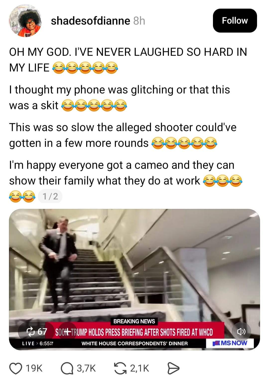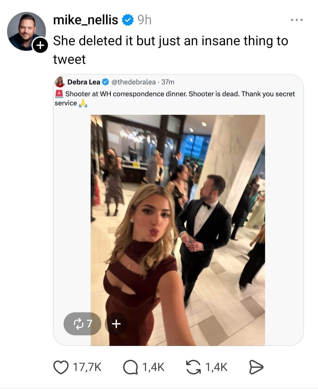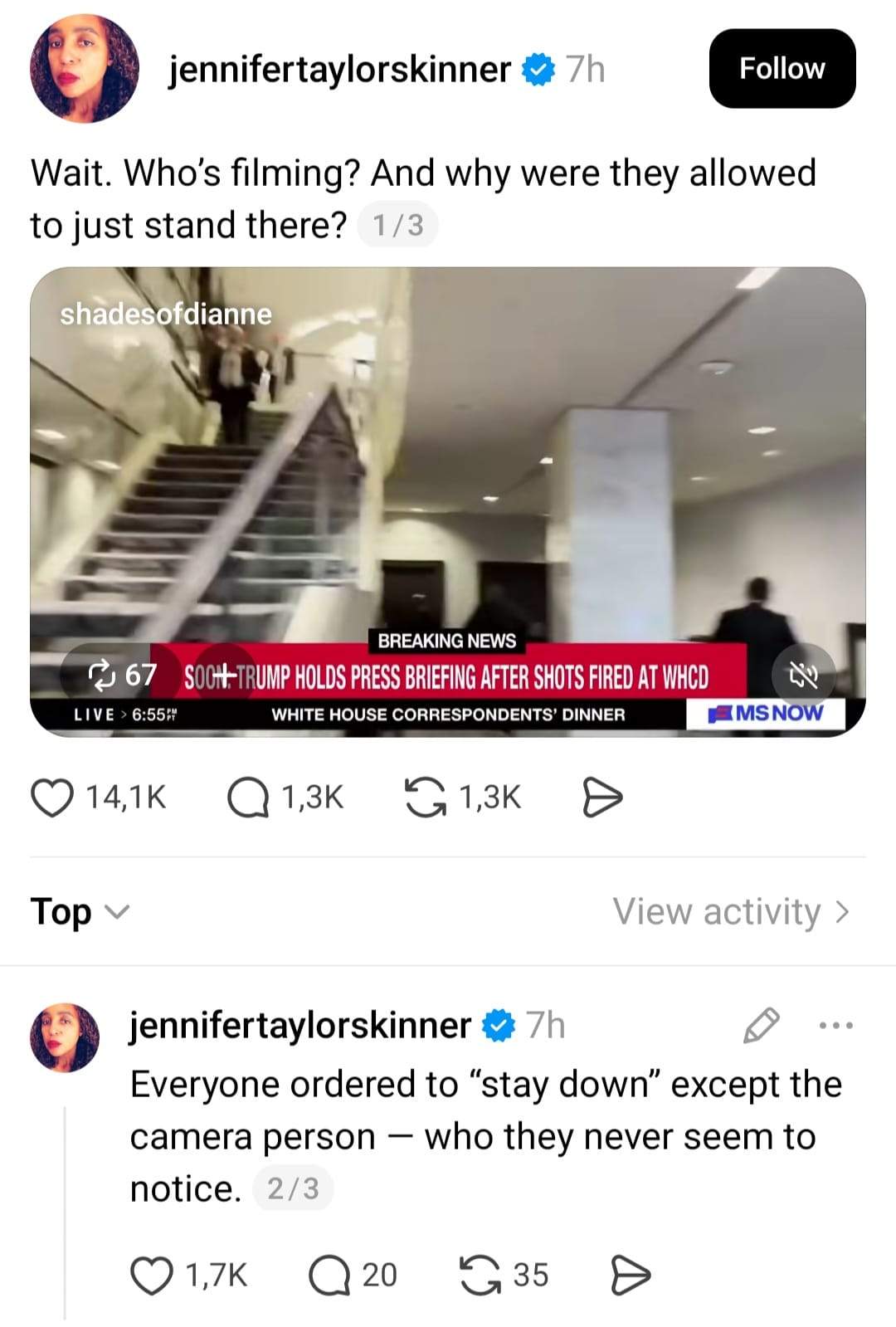 Как только раздался шум, Трамп, его супруга Мелания Трамп, вице-президент Джеймс Дэвид Вэнс и другие высокопоставленные сотрудники Белого дома были выведены из зала. Другие гости искали укрытие под столами.