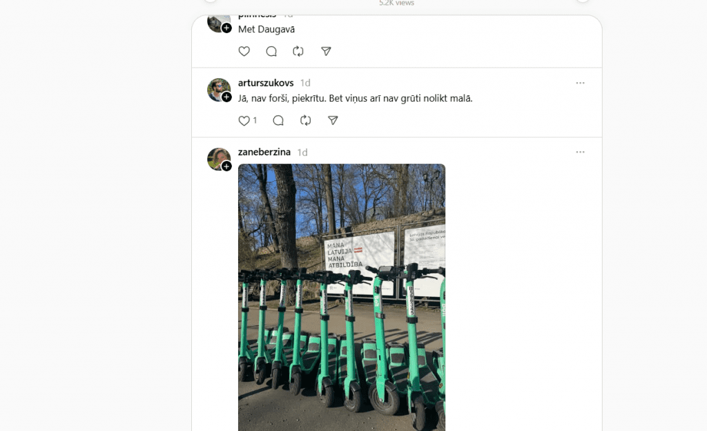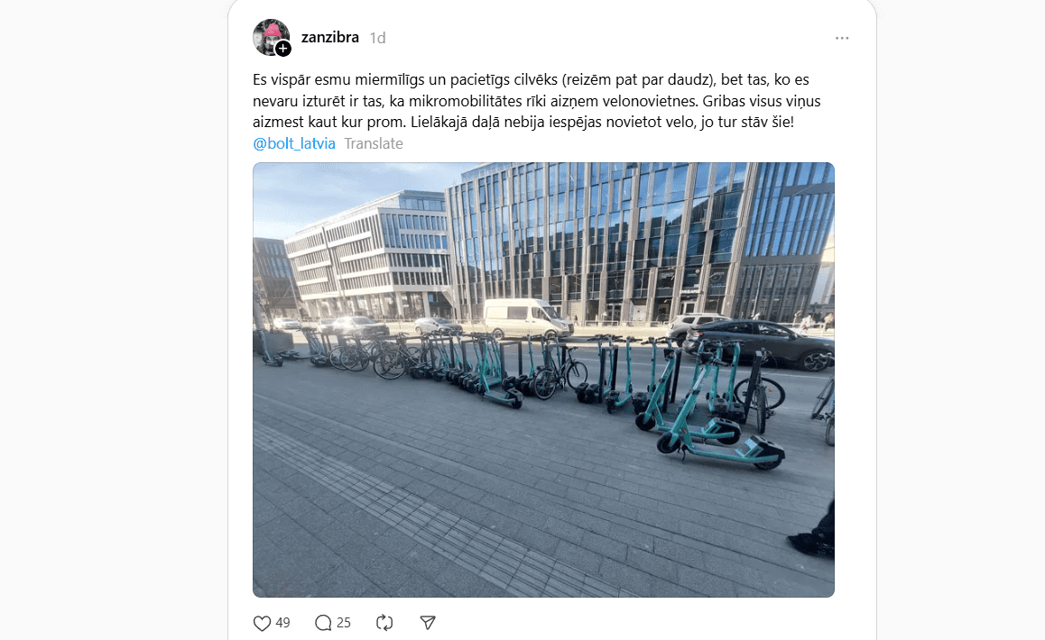 С первыми тёплыми лучами весеннего солнца на улицы Риги вернулась не только радость по этому поводу, но и столь хорошо знакомый «бардак с самокатами». Группы обсуждений в социальных сетях снова начинают заполняться фотографиями очевидцев, на которых видна уже привычная картина — электрические средства передвижения, которые во многих местах хаотично блокируют тротуары не только в самом центре Риги.
