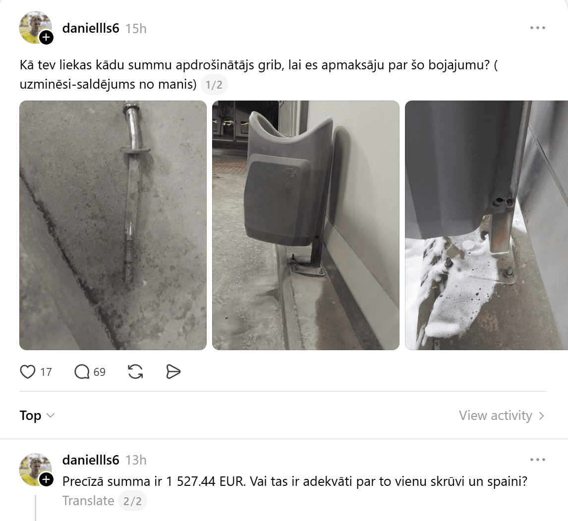 Он рассказывает, что за это, казалось бы, незначительное повреждение ему предстоит возместить весьма внушительную сумму — 1527,44 евро. Это показалось ему не только удивительным, но и несоразмерным, учитывая, что, по его мнению, на автомойке повреждено всего лишь ведро. «Разве это адекватно за один болт и ведро?» — спрашивает мужчина.
