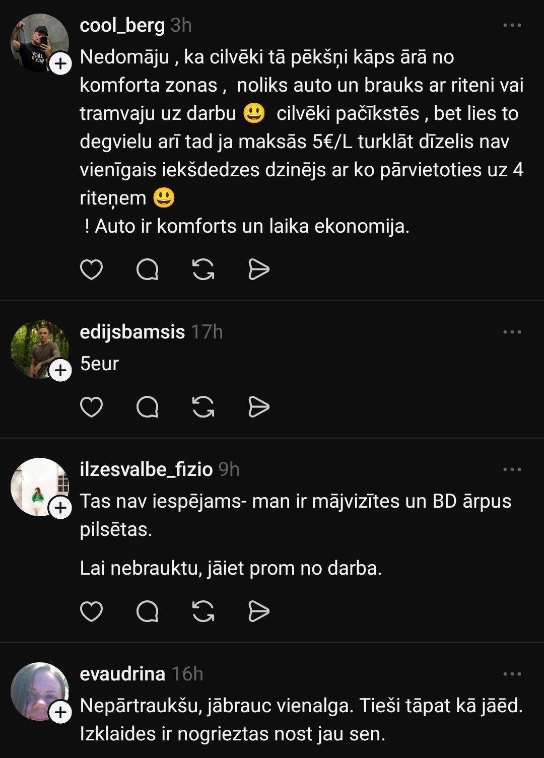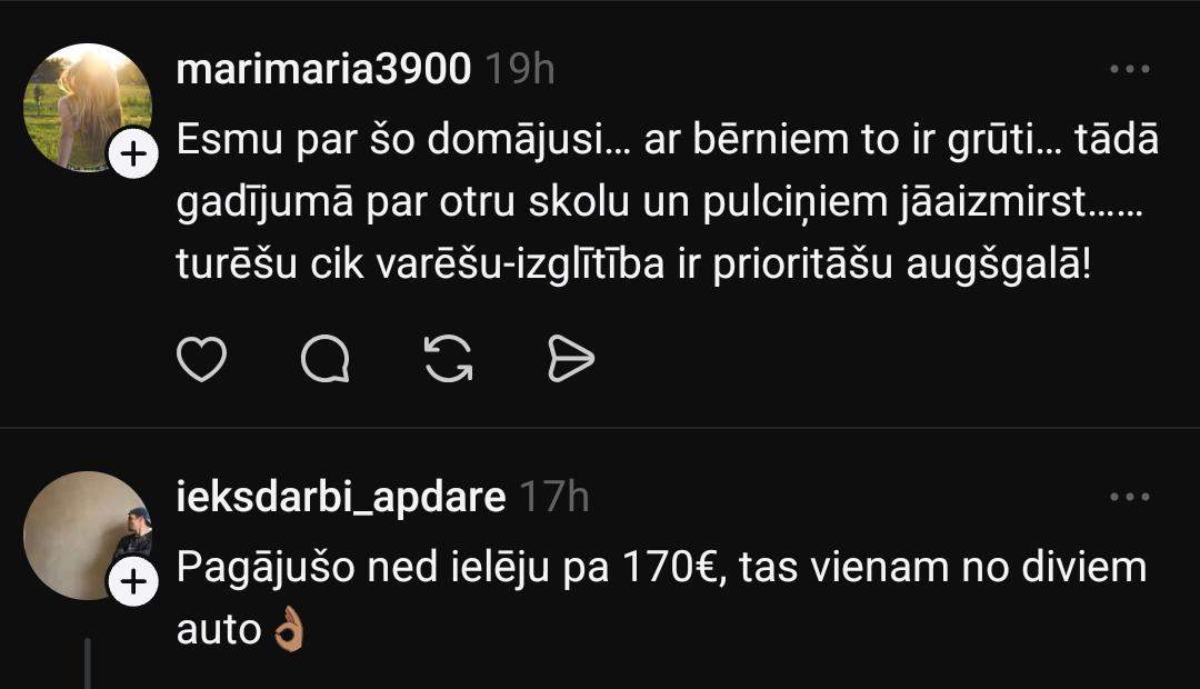 Иева экономит уже давно: “С 2024 года мы ввели режим экономии топлива. В деревню езжу только на общественном транспорте (разница есть — 15 евро или 60 евро). Ещё до большого роста цен мы задумались о покупке экономичного автомобиля (это уже сделано). На работу езжу на автобусе. Мы не считаем каждую копейку, но свои корректировки внесли, и, вероятно, в дальнейшем тоже что-то изменим.”