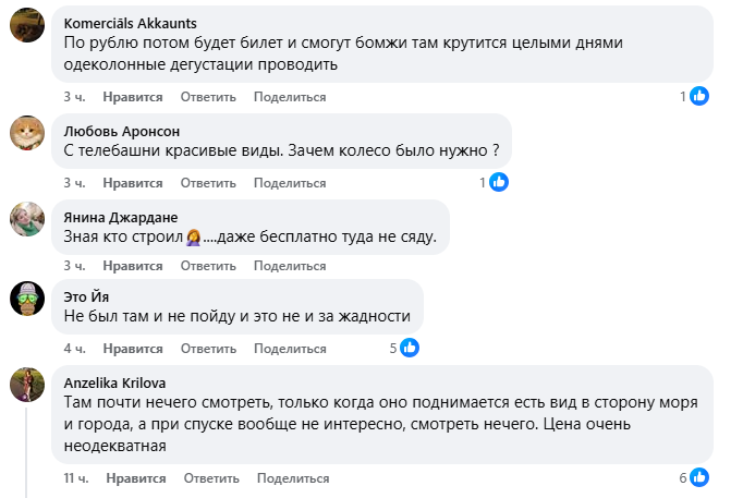 «Сколько ни проезжала мимо, ни разу не видела желающих прокатиться. И, честно говоря, не жаль — пусть администрация сама катается на этой дорогой и пугающей конструкции. Местным неинтересно после европейских колес, а туристов пока немного», — пишут пользователи. Также отмечается, что в будние дни колесо часто простаивает: «Я каждый день езжу мимо и редко вижу даже несколько человек. Часто оно вообще не работает».