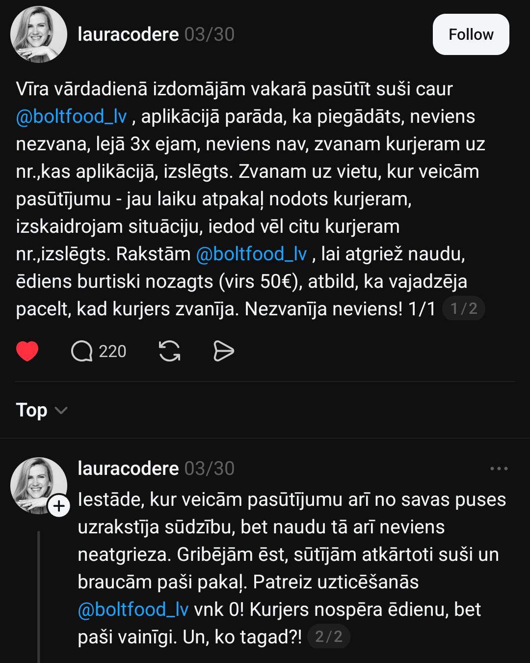 Она пишет: “В именины мужа мы решили вечером заказать суши через @boltfood_lv, в приложении показывается, что заказ доставлен, никто не звонит, три раза спускаемся вниз — никого нет, звоним курьеру по номеру, который указан в приложении, — телефон выключен.