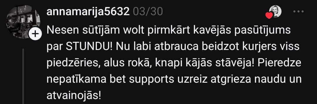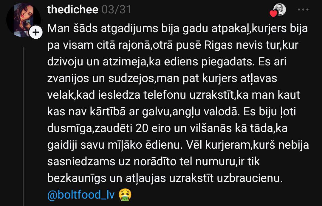 Рихарду тоже есть что рассказать: “@boltfood_lv служба поддержки клиентов ниже всякой критики. Неоднократно в заказе чего-то не хватало. Один раз вернули 1,75 евро из 5 евро стоимости, а во второй раз отказались возвращать из-за внутренней политики компании… Уже довольно давно мы с женой пользуемся только “Wolt”, отношение к клиентам там гораздо приятнее.”