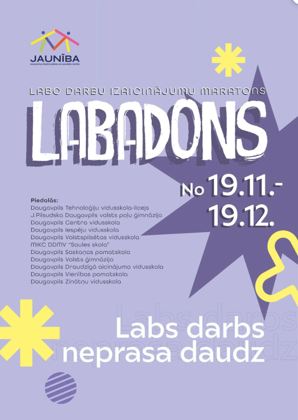 Школьные самоуправления Даугавпилса запустили акцию, цель которой — совершать полезные и позитивные поступки, помогать школе и местному сообществу, укреплять связь между школьными самоуправлениями и горожанами, а также развивать гражданскую активность и ответственность, сообщает Управление образования.