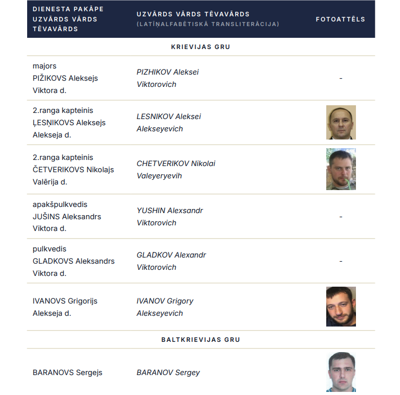 Служба военной разведки и безопасности (MIDD) опубликовала имена нескольких офицеров Главного управления Генерального штаба Вооружённых сил России (ГРУ) и одного офицера белорусского ГРУ, которые развернули агентурную разведку против Латвии.