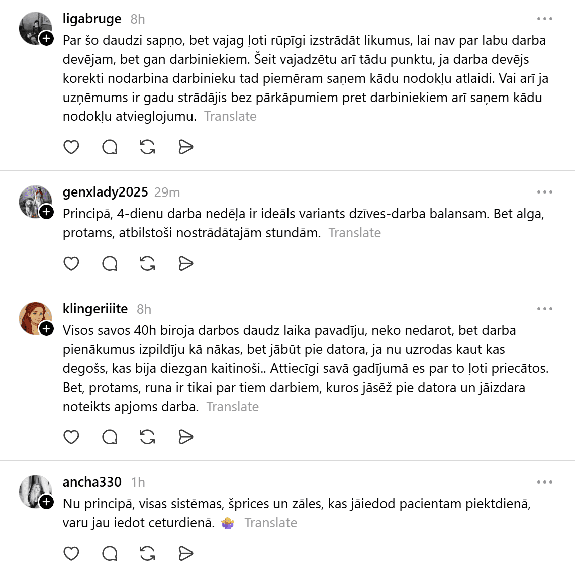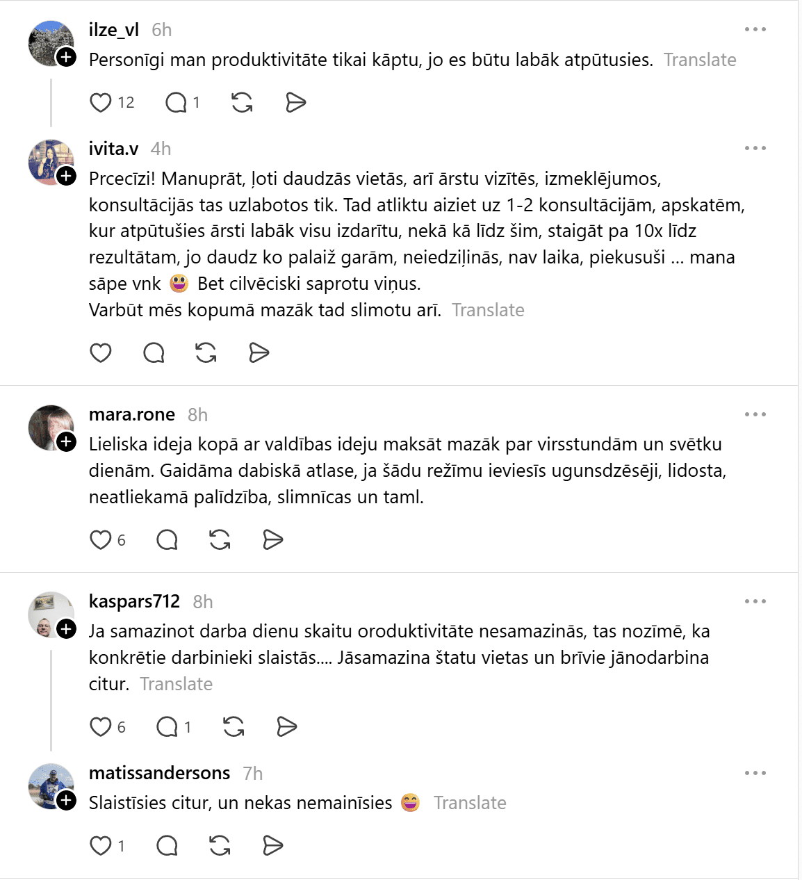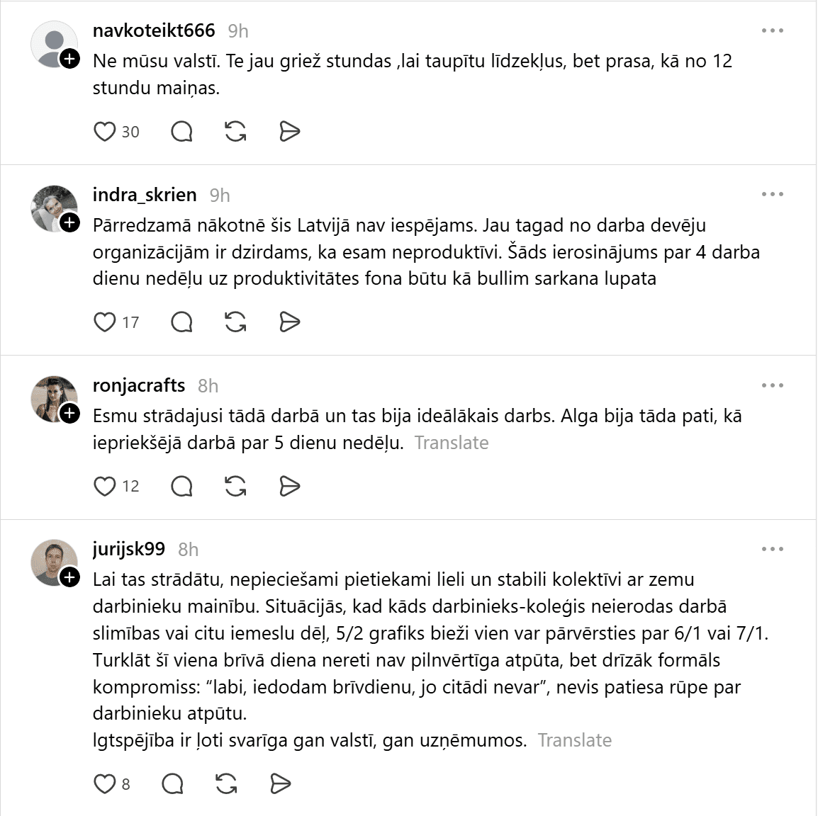 Этот вопрос очень быстро привлёк большое внимание и вызвал широкую дискуссию. Идея более короткой рабочей недели многим кажется привлекательной, поскольку это означало бы больше времени для семьи, отдыха и личных интересов. В то же время она заставляет задуматься и о том, позволит ли рынок труда и экономическая ситуация Латвии вообще внедрить такие изменения.