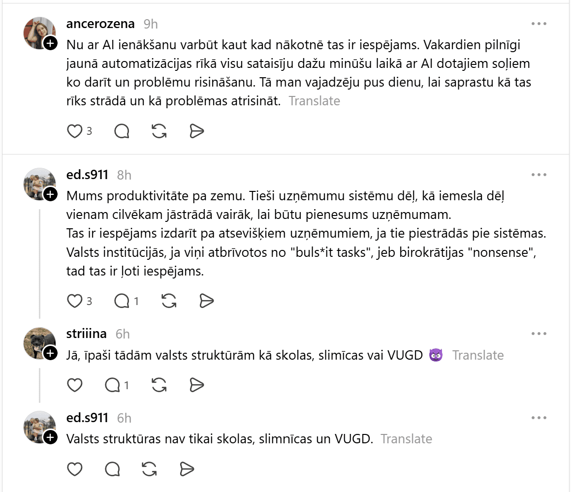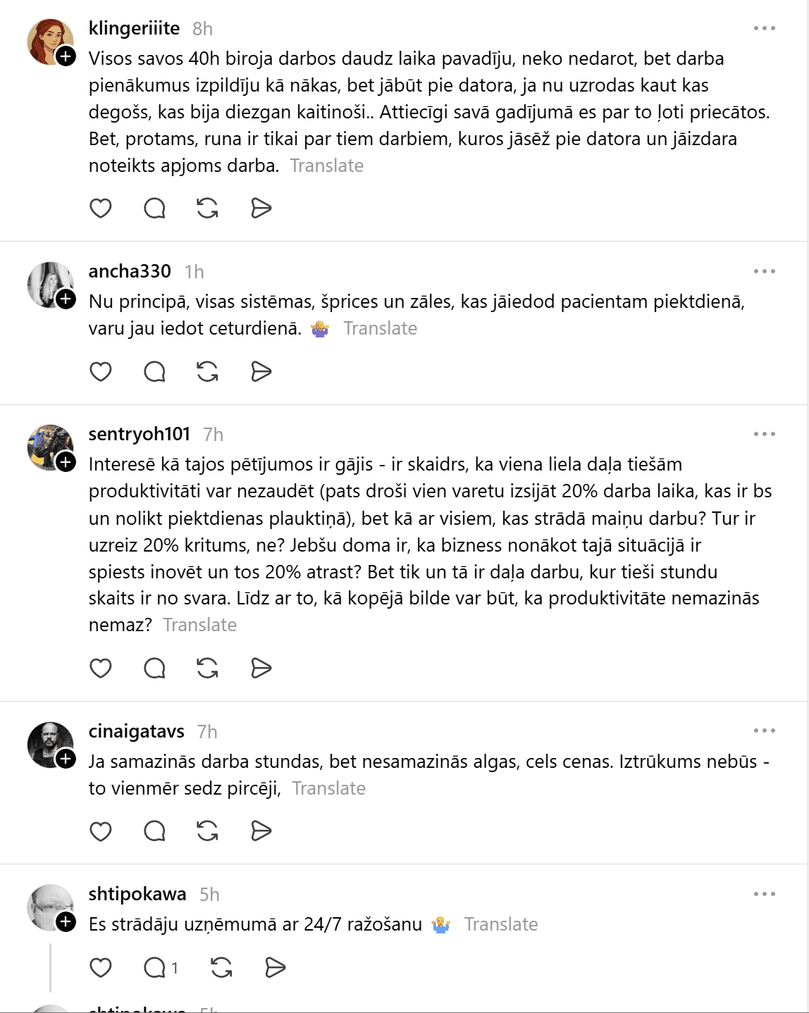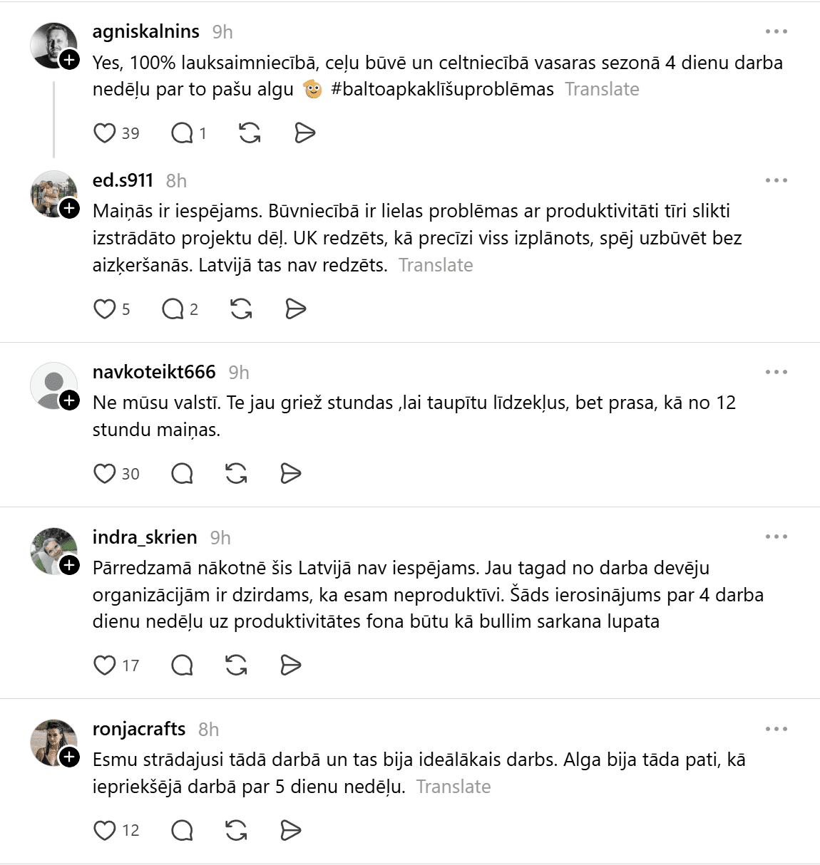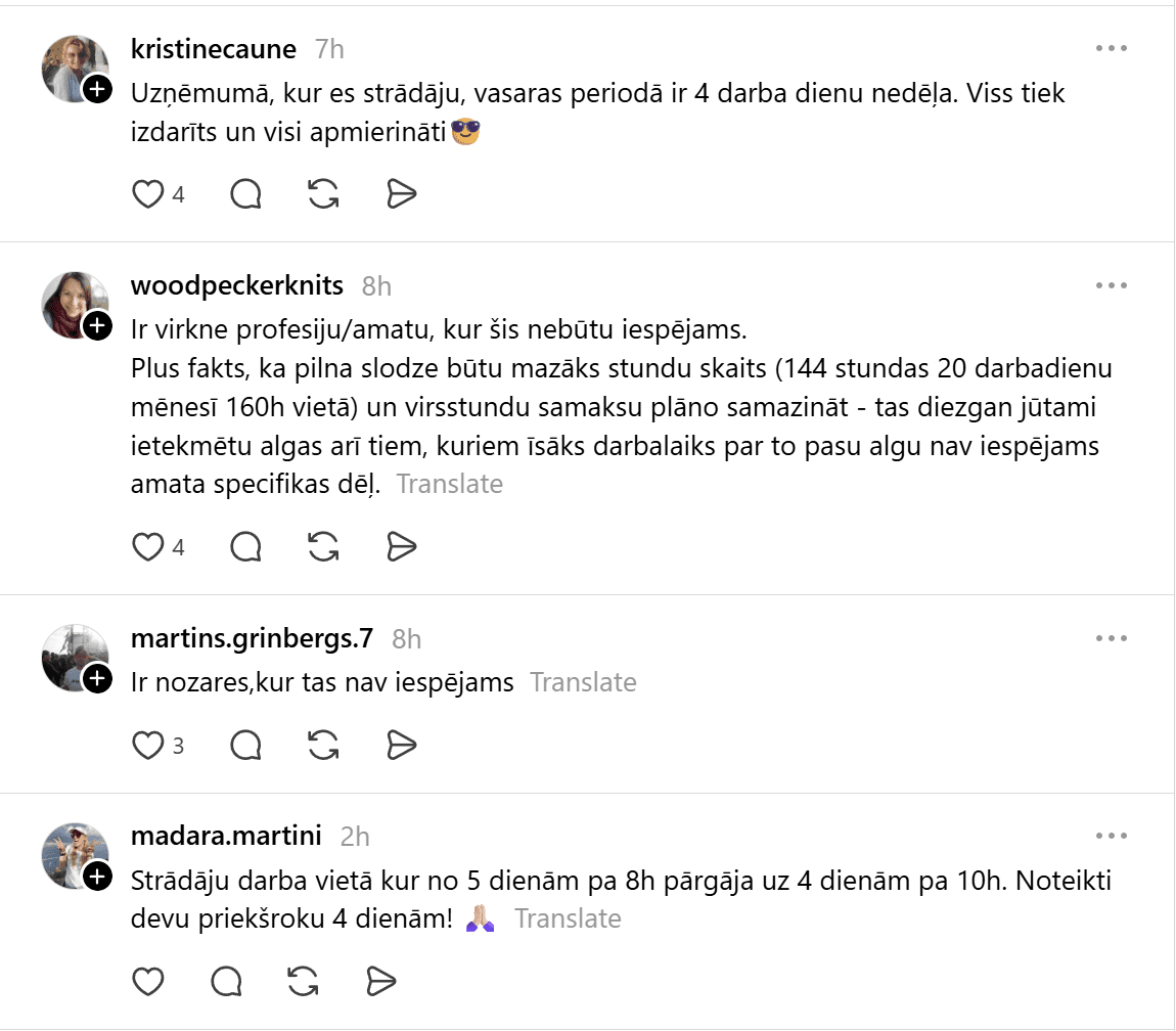 Этот вопрос очень быстро привлёк большое внимание и вызвал широкую дискуссию. Идея более короткой рабочей недели многим кажется привлекательной, поскольку это означало бы больше времени для семьи, отдыха и личных интересов. В то же время она заставляет задуматься и о том, позволит ли рынок труда и экономическая ситуация Латвии вообще внедрить такие изменения.