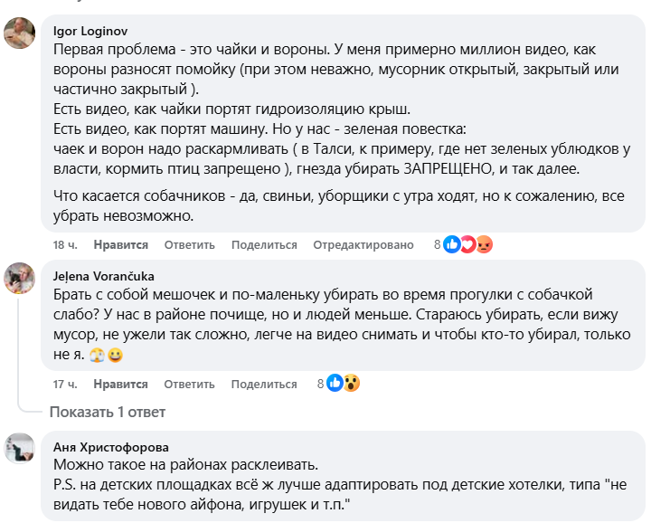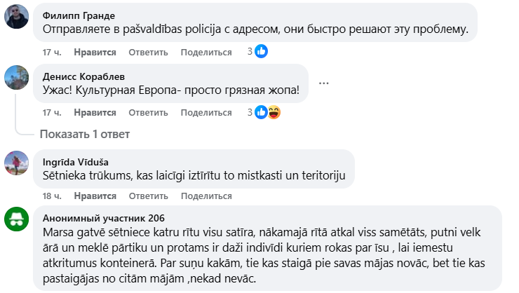 В свою очередь, жители улицы Марсас гатве отмечают, что, несмотря на усилия дворника, ситуация с чистотой района остаётся проблемной. “С утра дворник всё подметает, а на следующий день всё снова разбросано. Птицы разрывают мусор в поисках еды, а есть и люди, которым слишком лень выбросить отходы в контейнер”, — пишет один из местных жителей.