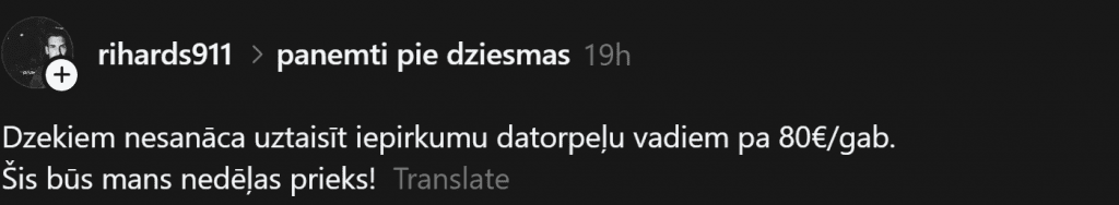 «Приходилось работать с закупками, то есть выигрывать конкурсы на поставки. Понимаю, что иногда так покрываются другие расходы, которые выше указанных, но почему это нельзя реально показать, а нужно продавать товар за 5 евро по 30…80…120 евро? Тогда мне сказали: если начнём указывать реальные цены и расходы, то и в других конкурсах будут требовать такой же экономии. Также бывало участие в закупках, где, наоборот, желая показать, что можно дешевле, закупали неподходящие материалы, которые не годились, и приходилось объявлять новый конкурс.»